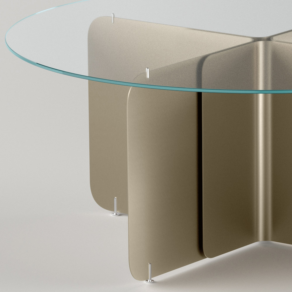 Această masă este o fuziune încântătoare de eleganță minimalistă și funcționalitate contemporană , perfectă pentru cei care caută o piesă de mobilier distinctă, dar discretă. Suprafața de sticlă transparentă oferă o vedere completă a structurilor de dedesubt, prezentând bazele geometrice în nuanțe de șampanie.