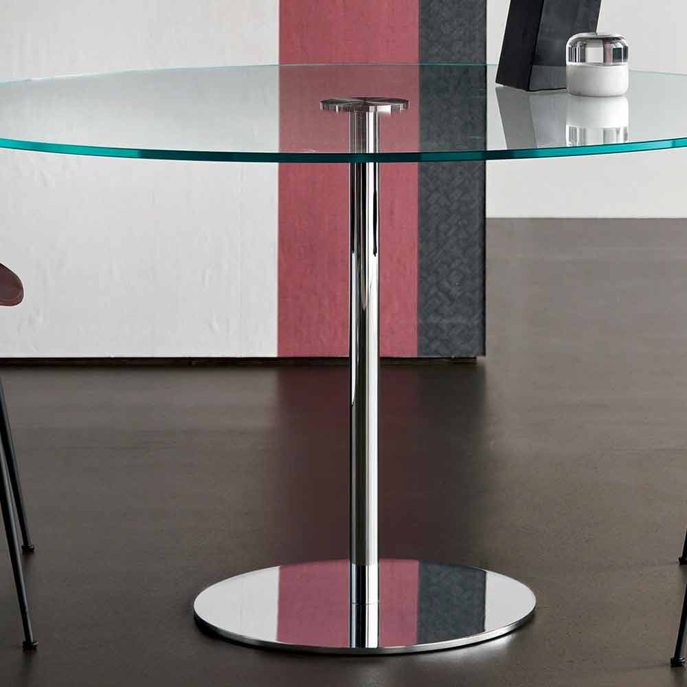 Masă rotundă de lux, cu blat din sticlă extra-limpede și bază metalică cromată, realizată în Italia.
