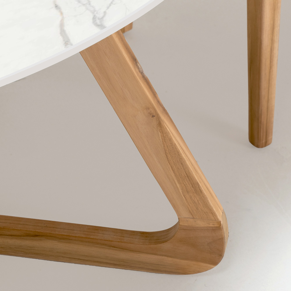 Baza din lemn nu numai că susține solid blatul robust din ceramică, dar adaugă și o notă de căldură naturală, creând un contrast vizual captivant cu blatul lucios din marmură. Această combinație nu este doar plăcută din punct de vedere estetic , ci oferă și durabilitate și rezistență la intemperii , făcând masa ideală pentru utilizarea zilnică în aer liber.