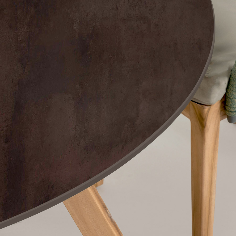 fabricată în întregime în Italia. Această masă de exterior este o piesă de design inspirată de estetica industrială și farmecul rustic al ceramicii metalice Corten. Combină o bază din lemn cu un blat ceramic care imită culoarea și textura metalului Corten, cunoscut pentru aspectul său ruginit distinctiv, care se îmbină perfect cu decorurile exterioare naturale și moderne.
