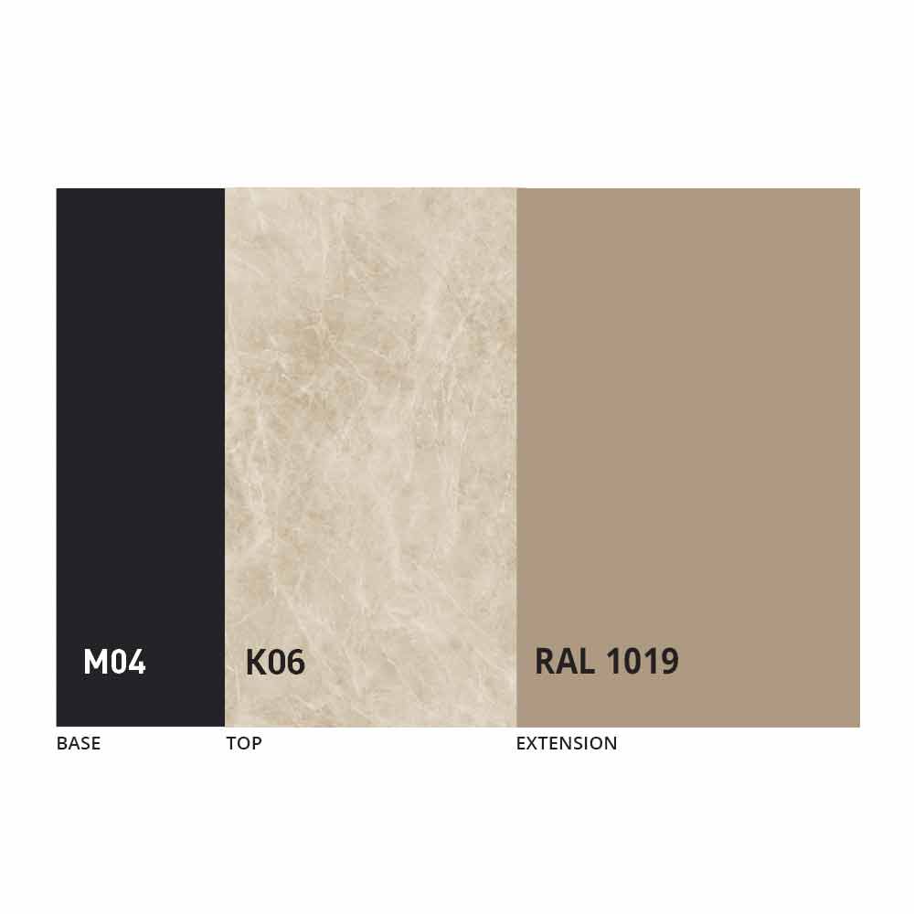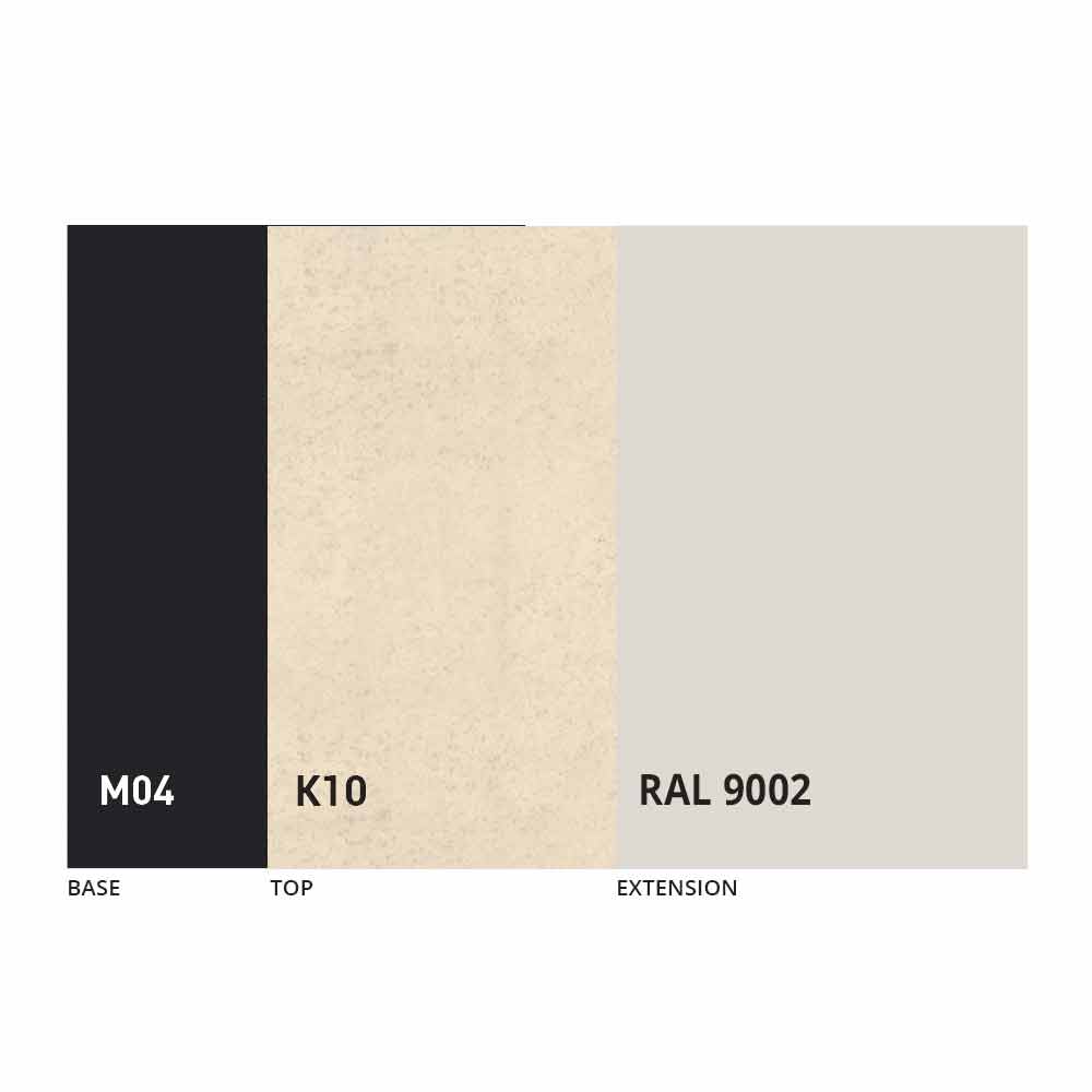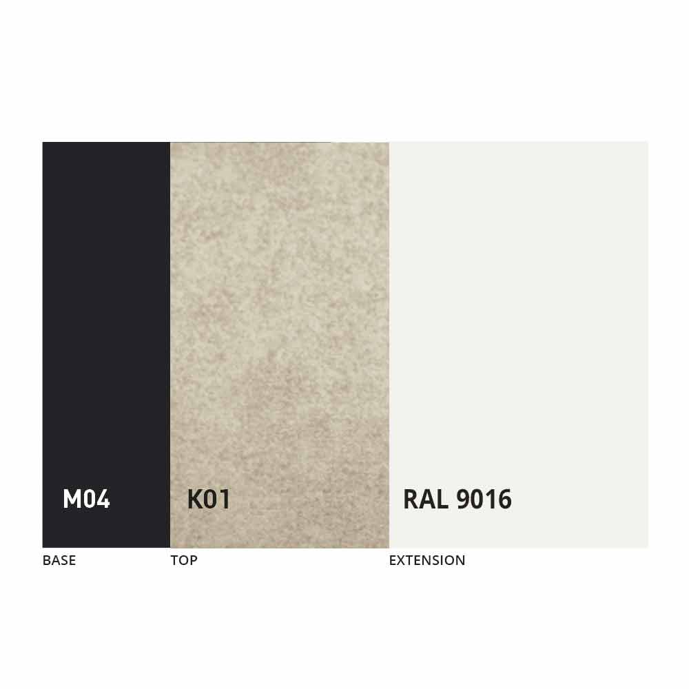 Blatul și baza mesei pot fi personalizate cu diferite materiale și finisaje mostre sau lacuire RAL. Pentru informații, contactați-ne folosind formularul corespunzător „