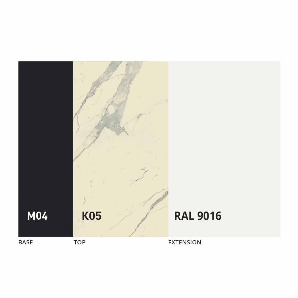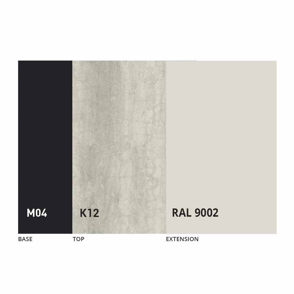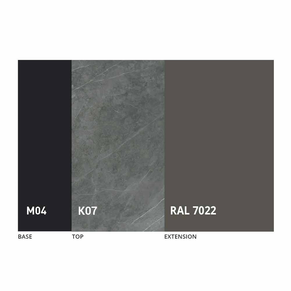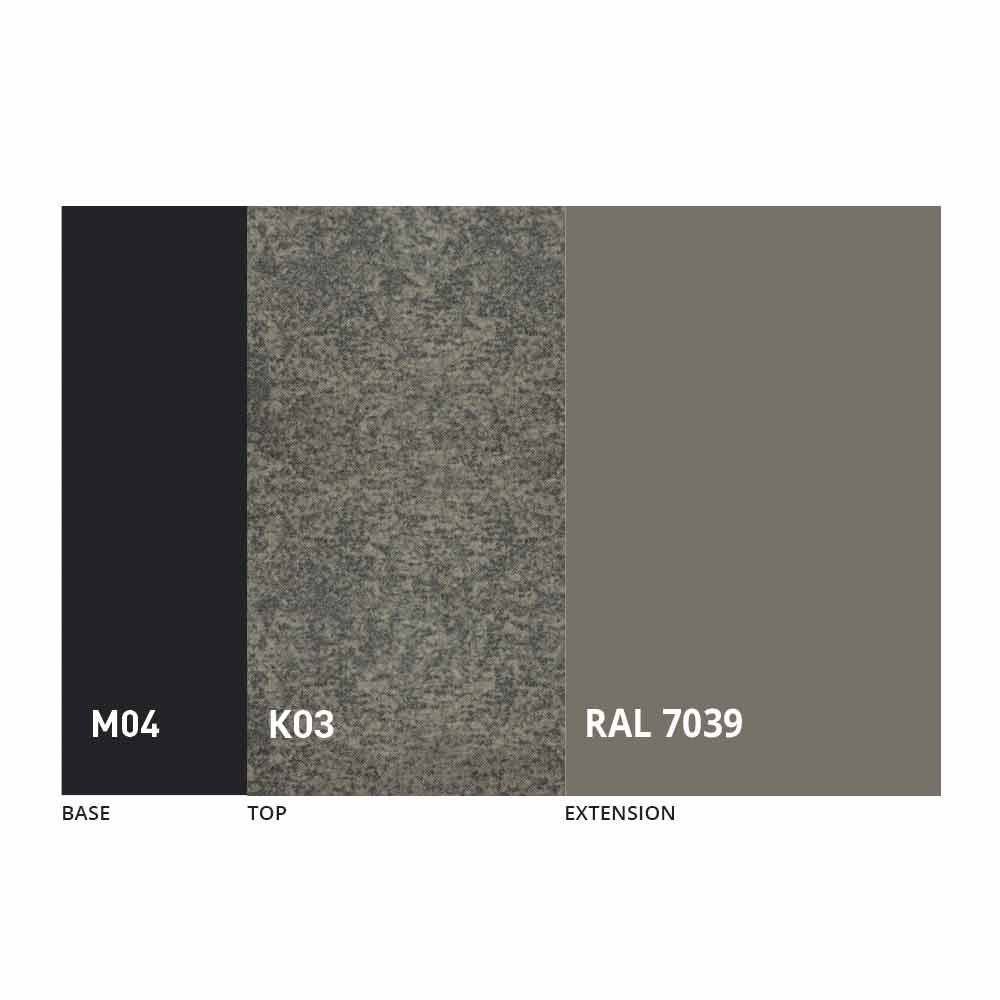 Blatul și baza mesei pot fi personalizate cu diferite materiale și finisaje mostre sau lacuire RAL. Pentru informații, contactați-ne folosind formularul corespunzător „