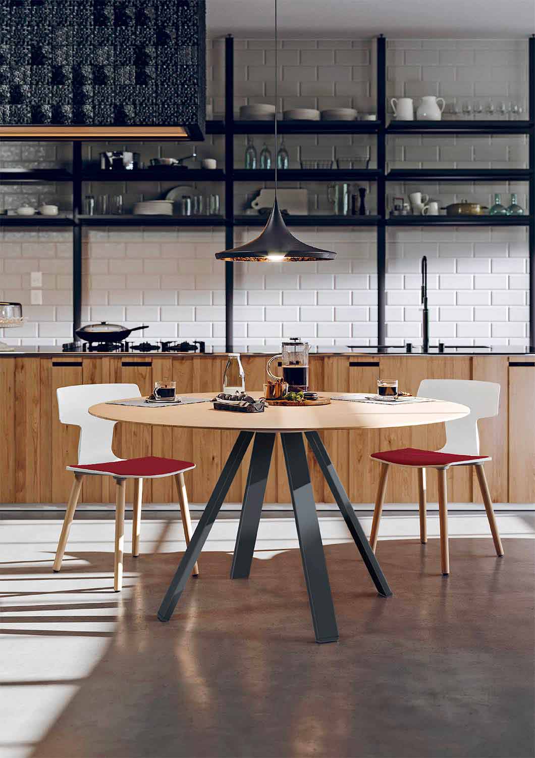 Această masă de sufragerie este caracterizată de o structură metalică vopsită în alb sau negru , formată din 4 picioare dispuse într-un model de arsuri solare, care permit stabilitatea și robustetea . Baza permite, de asemenea, masa să dobândească eleganță și versatilitate, făcând-o ușor combinabilă cu orice stil de mobilier. Blatul este din MDF de culoare stejar și este disponibil în 2 diametre diferite pentru a se adapta perfect la fiecare nevoie.
