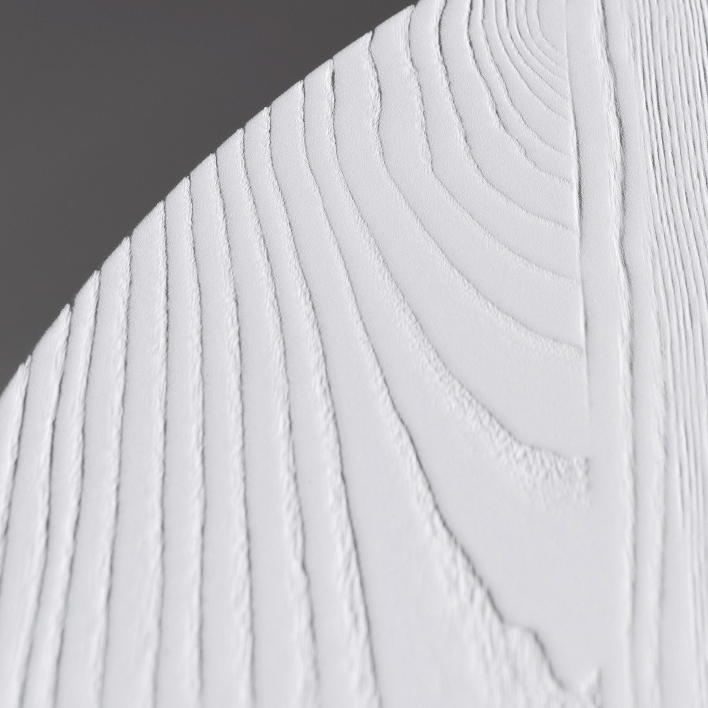 Fabricată din placaj de frasin tratat termic , masa evidențiază fibra naturală a lemnului, amplificând caracterul texturat și profunzimea cromatică. Este disponibilă și în lac negru sau alb , ceea ce o face suficient de versatilă pentru a se adapta la o varietate de stiluri, de la minimal la îndrăzneț și grafic.