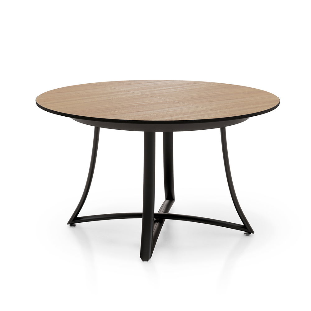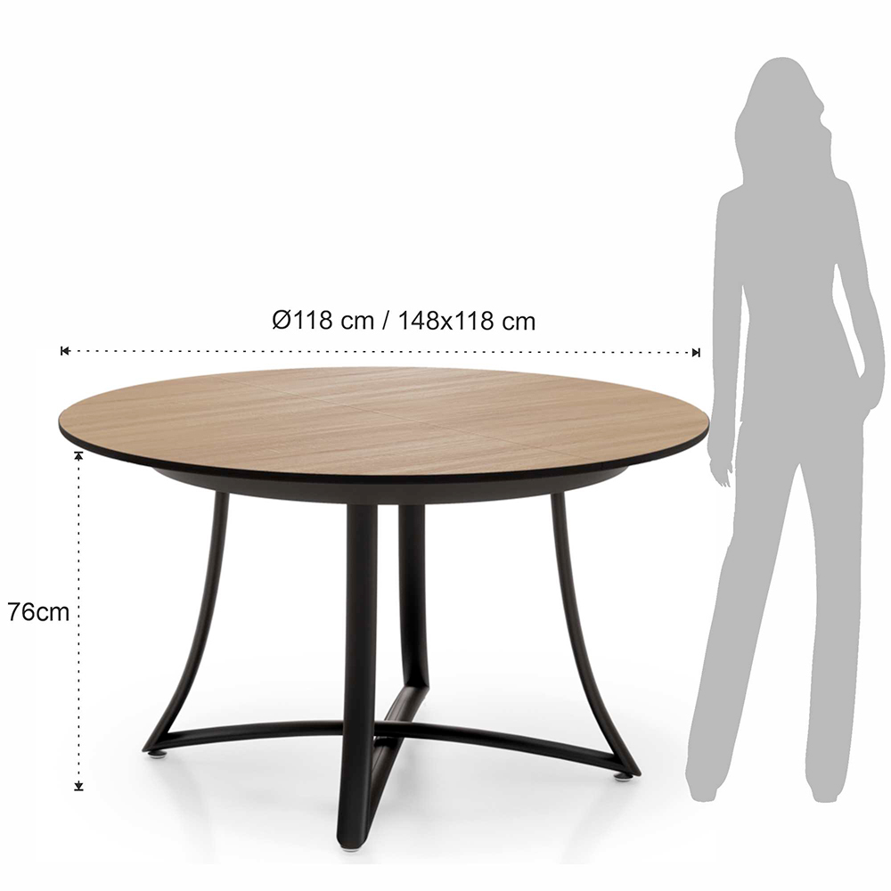 Această masă rotundă extensibilă este un exemplu perfect de design modern care combină funcționalitatea și stilul. Cu blatul din lemn, această masă transmite o atmosferă caldă și primitoare, în timp ce baza din metal negru oferă un contrast vizual puternic care adaugă o notă de eleganță contemporană întregului.