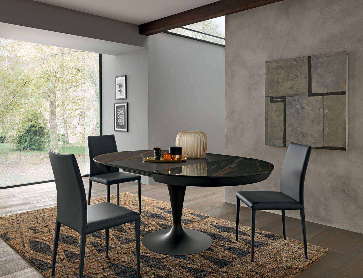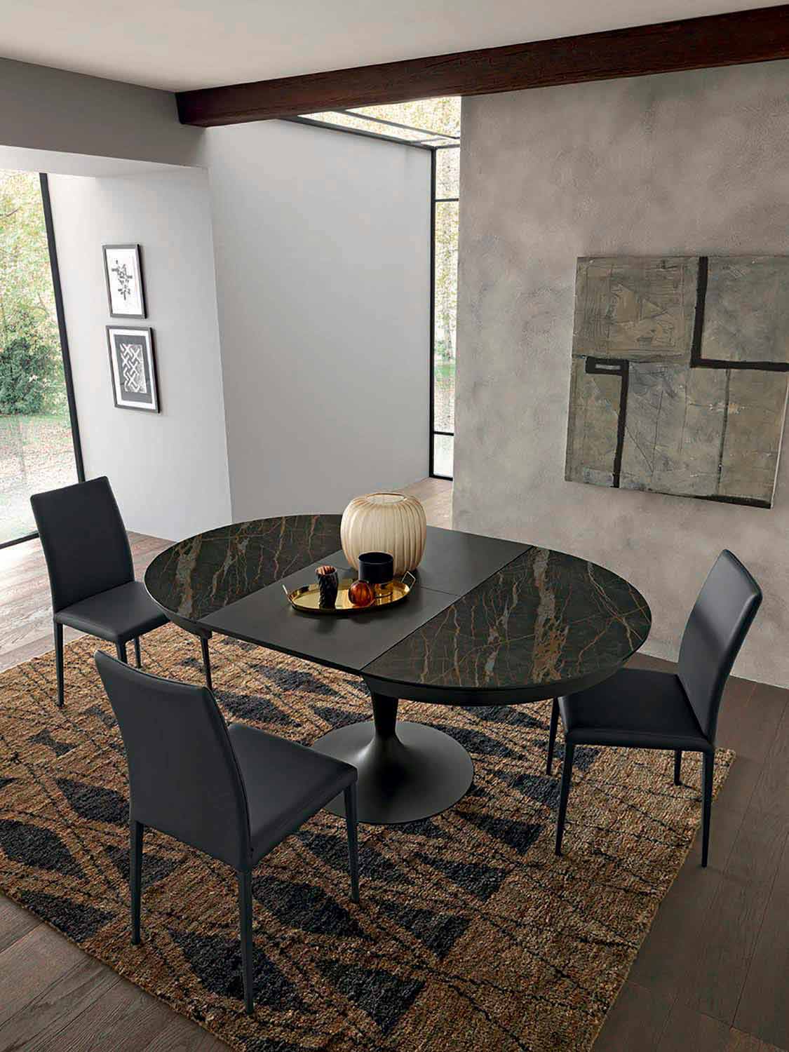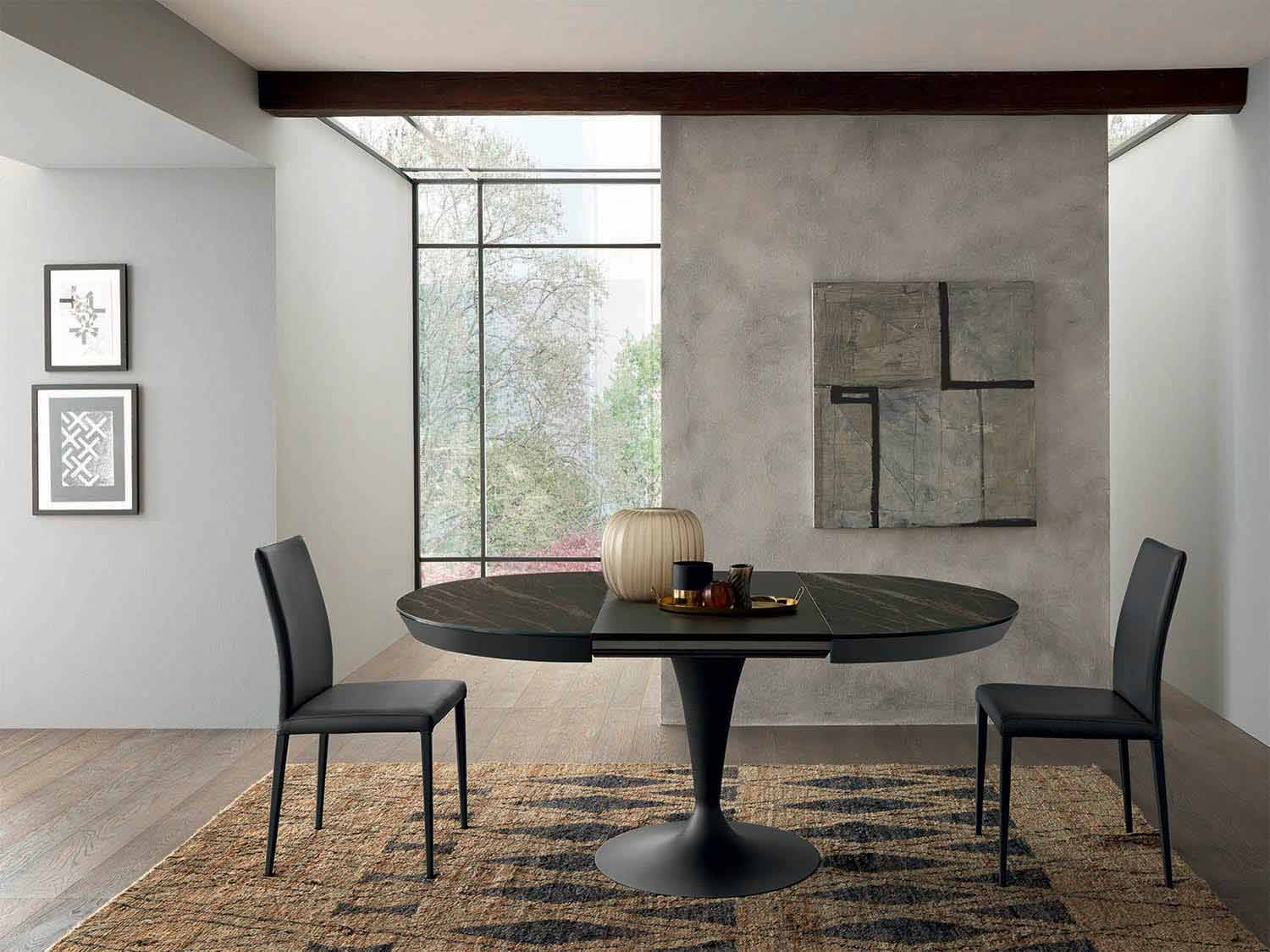 Masa de sufragerie cu design extensibil cu blat rotund din ceramica laminata si baza metalica Made in Italy.