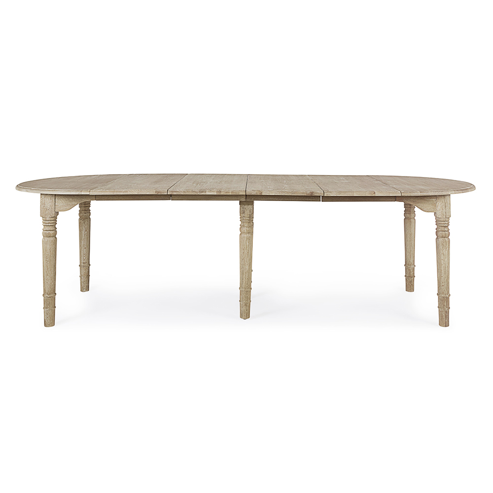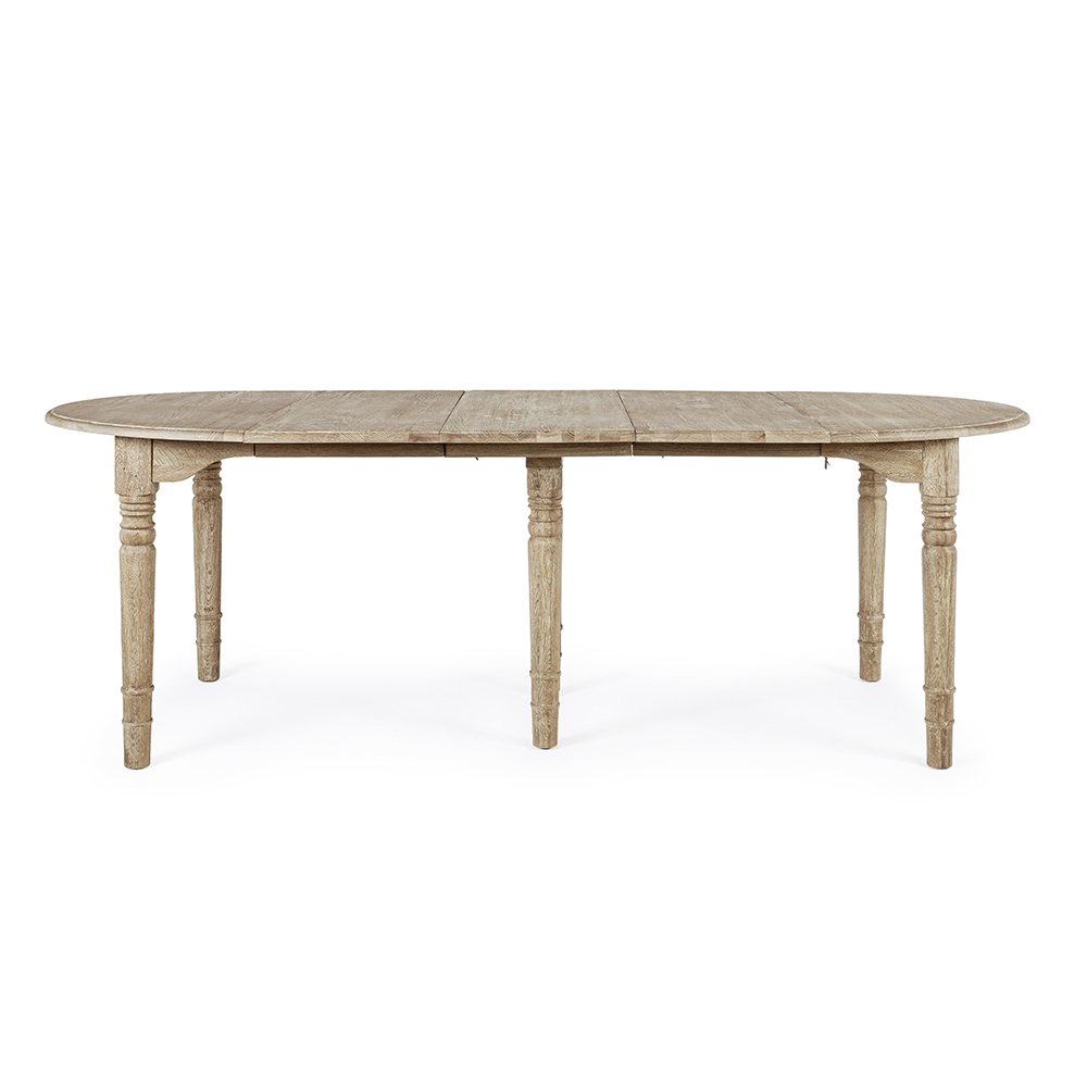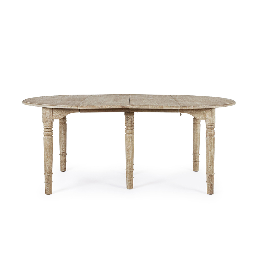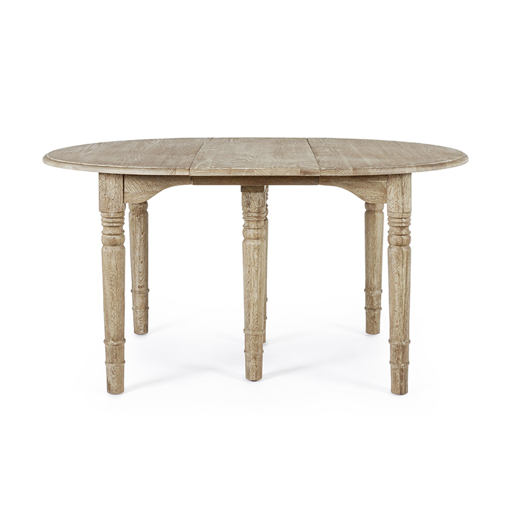 Masa rotunda si extensibila din lemn finisaj invechit pentru pana la 10 persoane.