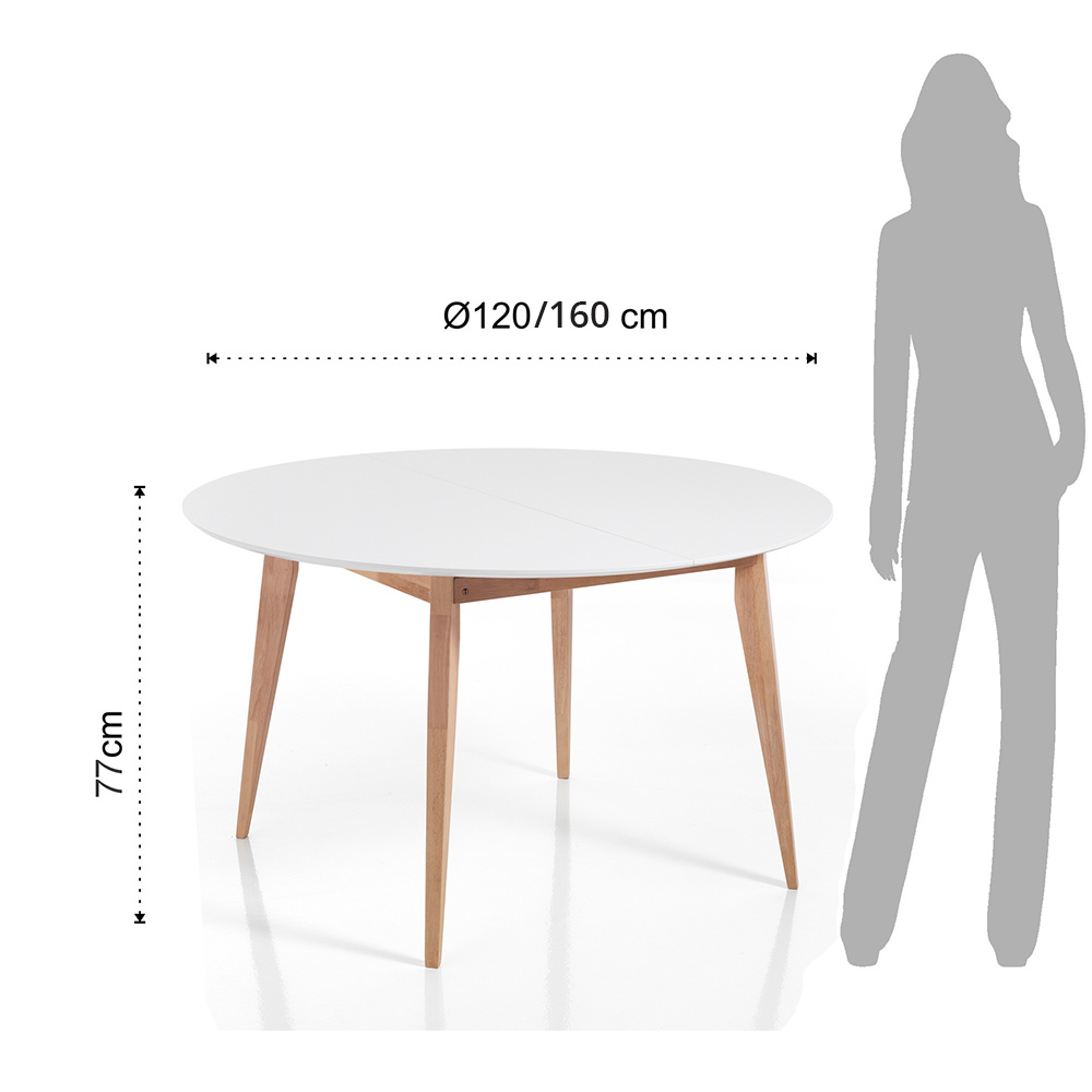 Masa de sufragerie cu blat rotund extensibil din mdf lacuit alb mat (grosime 3 cm) si picioare din lemn masiv cu finisaj stejar albit . Un produs cu un design simplu si curat, ideal pentru cei care iubesc un stil de mobilier esential si versatil capabil sa completeze stilul sufrageriei sau bucatariei lor cu gust si personalitate. Punctul său forte este reprezentat de blatul extensibil care, datorită unei extensii de 40 cm fiecare, ajunge la o lungime de 160 cm.
