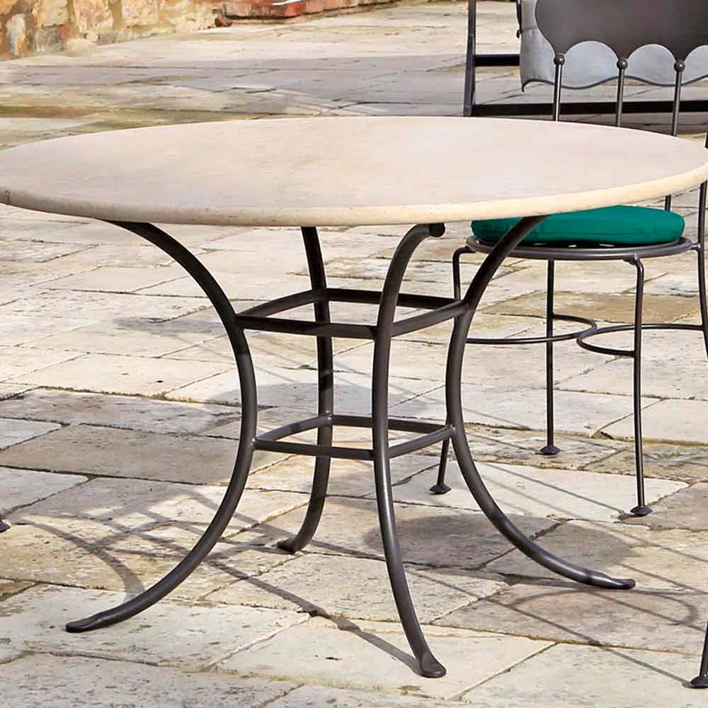 Masă de luat masa artizanală cu blat rotund în travertin Made in Italy.