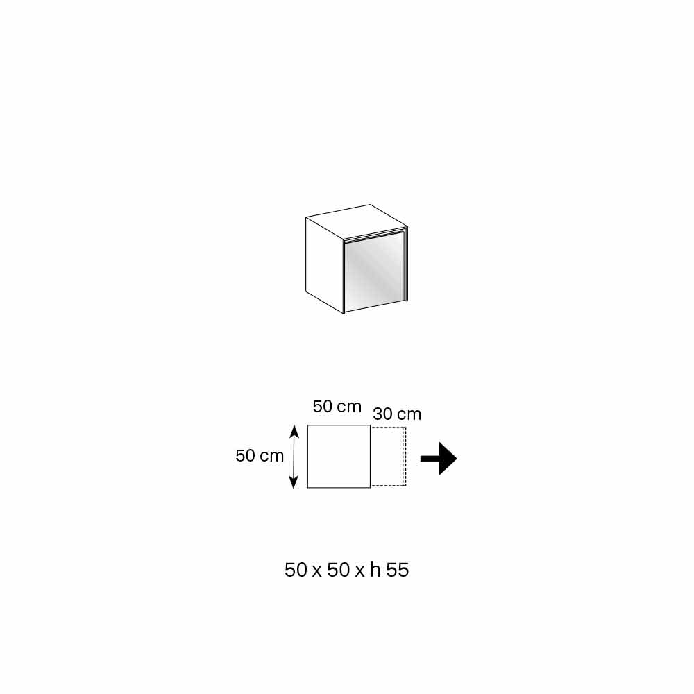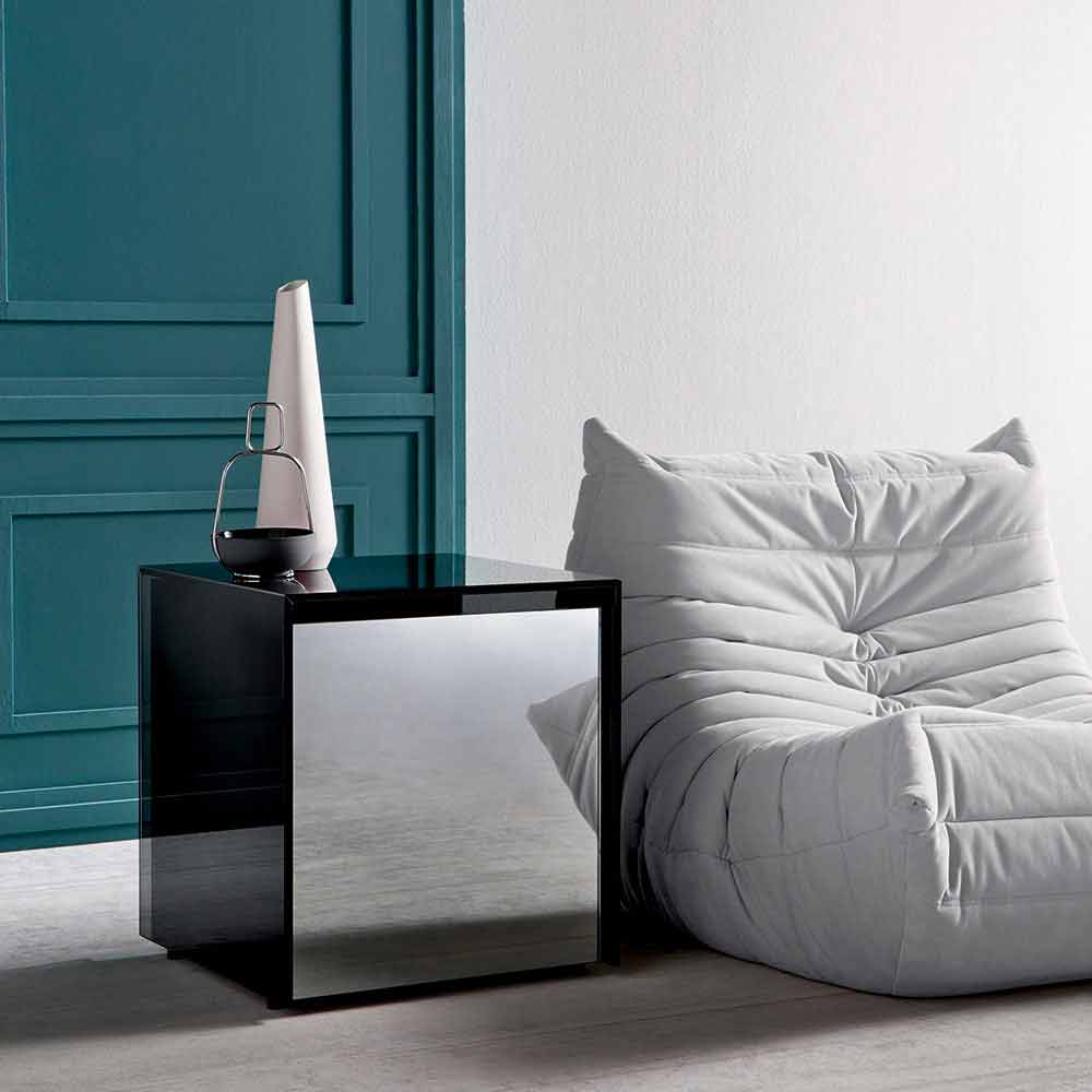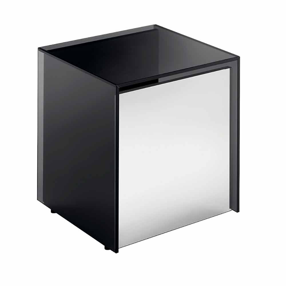 Particularitatea este dată de sticla afumată cu care este realizată, utilizată pentru structura exterioară, în timp ce efectul „Văd nu văd” al sertarului interior din lemn negru creează o construcție rafinată și elegantă.