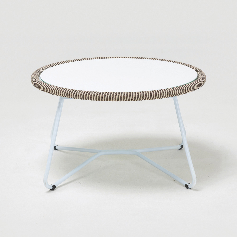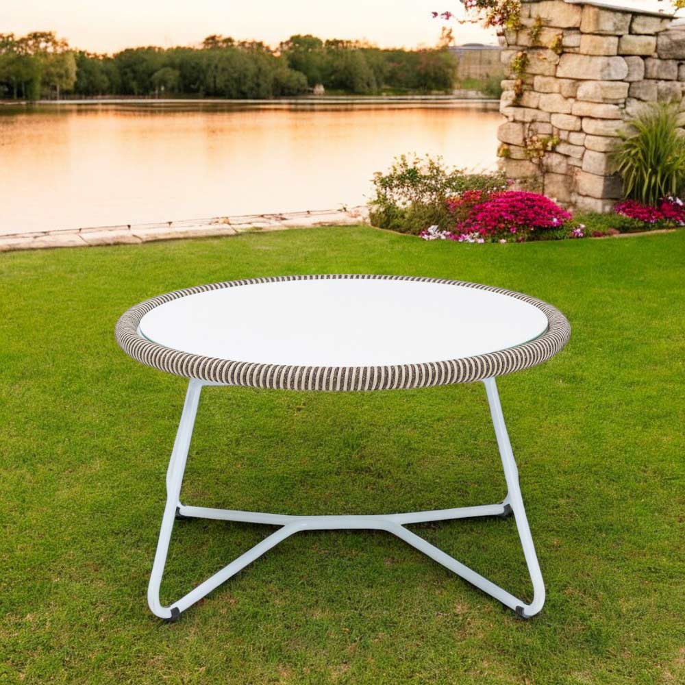 Această masă de grădină este întruchiparea întâlnirii dintre design și funcționalitate în forma sa cea mai pură și mai rafinată stilistic. Blatul rotund este împletit cu îndemânare, creând un efect vizual sugestiv care atrage privirea și invită la atingere. Baza din aluminiu vopsit conferă mesei o lejeritate aproape eterică, asigurând în același timp stabilitate și rezistență la condițiile de exterior.