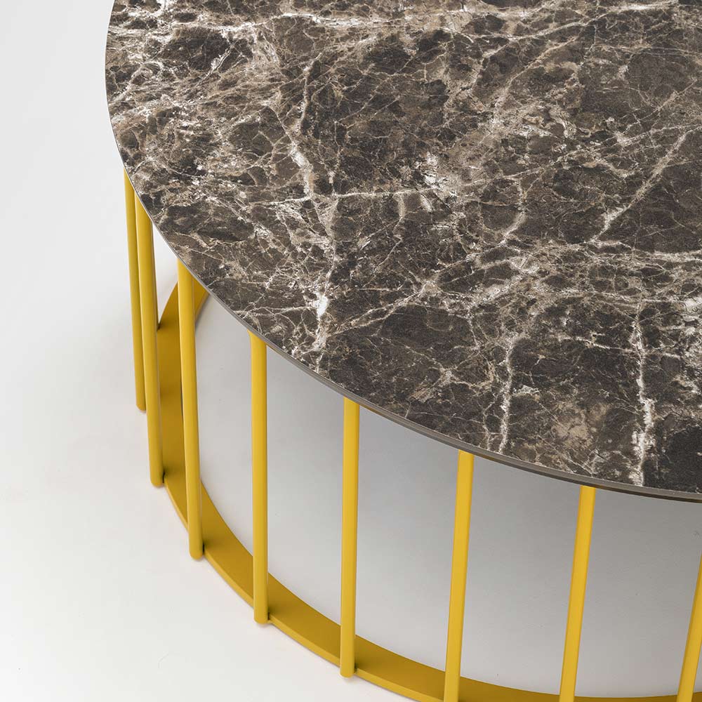 in Italia . O piesă de mobilier cu un stil simplu punctat de forme și linii esențiale care o fac perfectă pentru a aduce practic, stil și culoare în orice spațiu exterior, atât casnic, cât și contract, precum grădini, curți sau lângă piscină. Punctul său forte este reprezentat de originalitatea bazei compuse din raze echidistante care pornesc de la baza circulară și merg drept în sus, îndoindu-se spre exterior pe o parte pentru a crea un