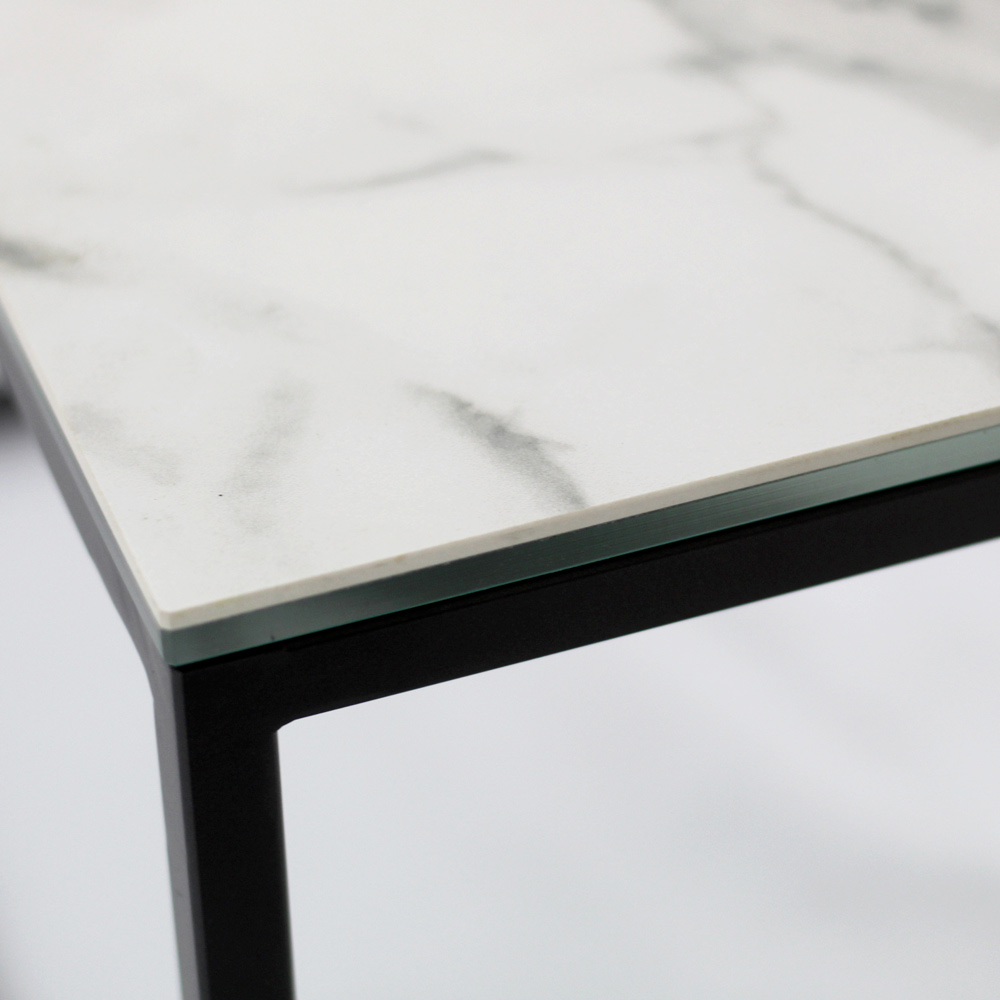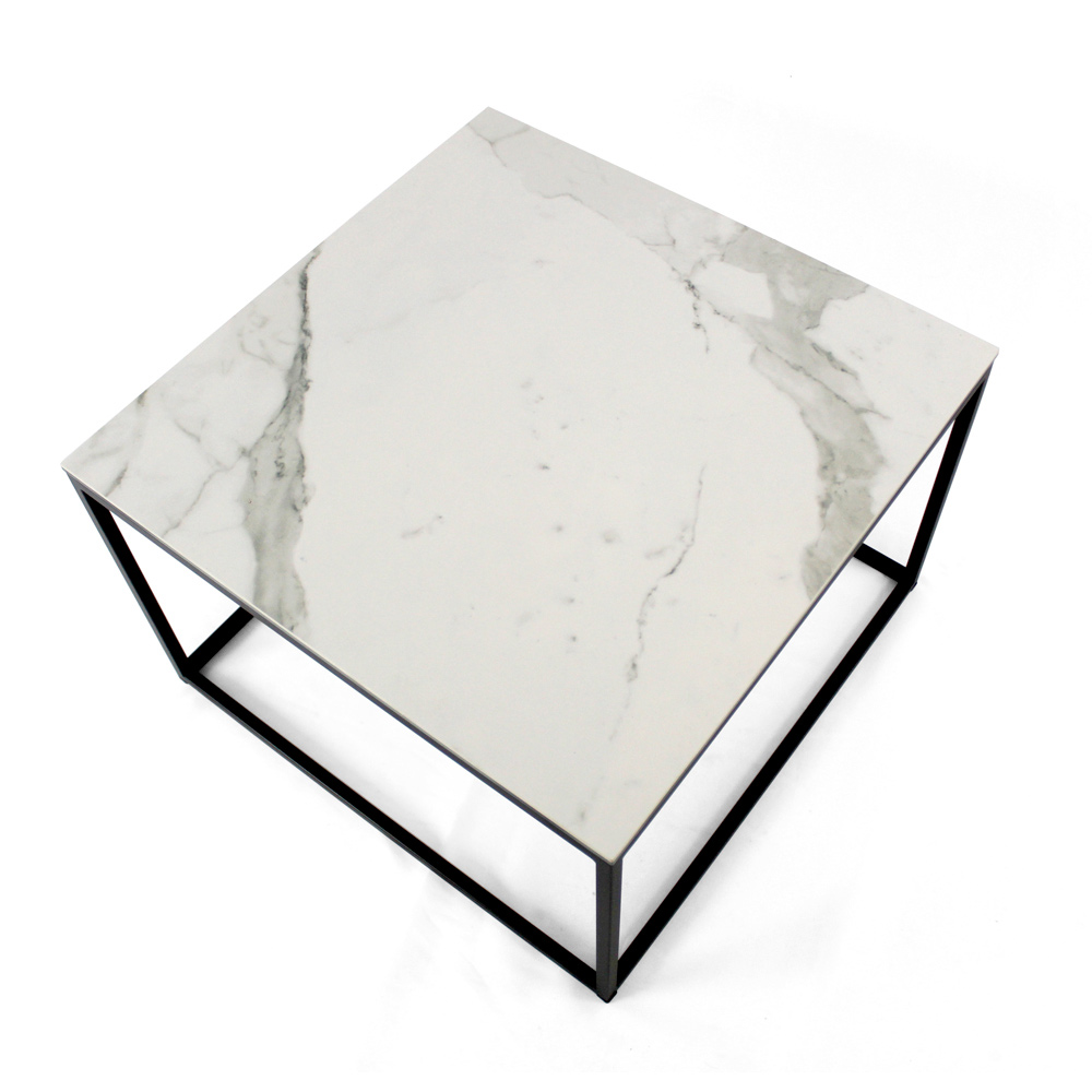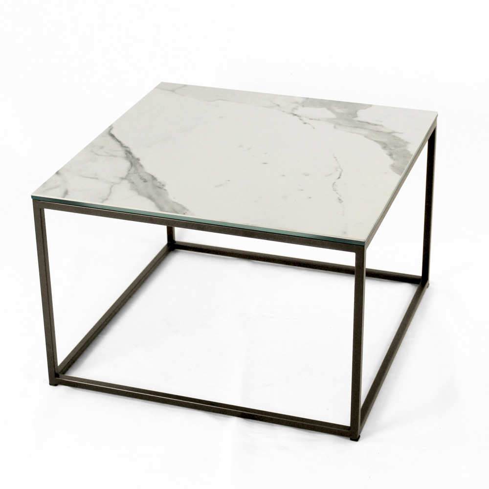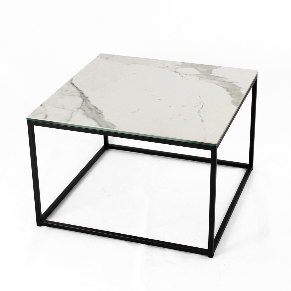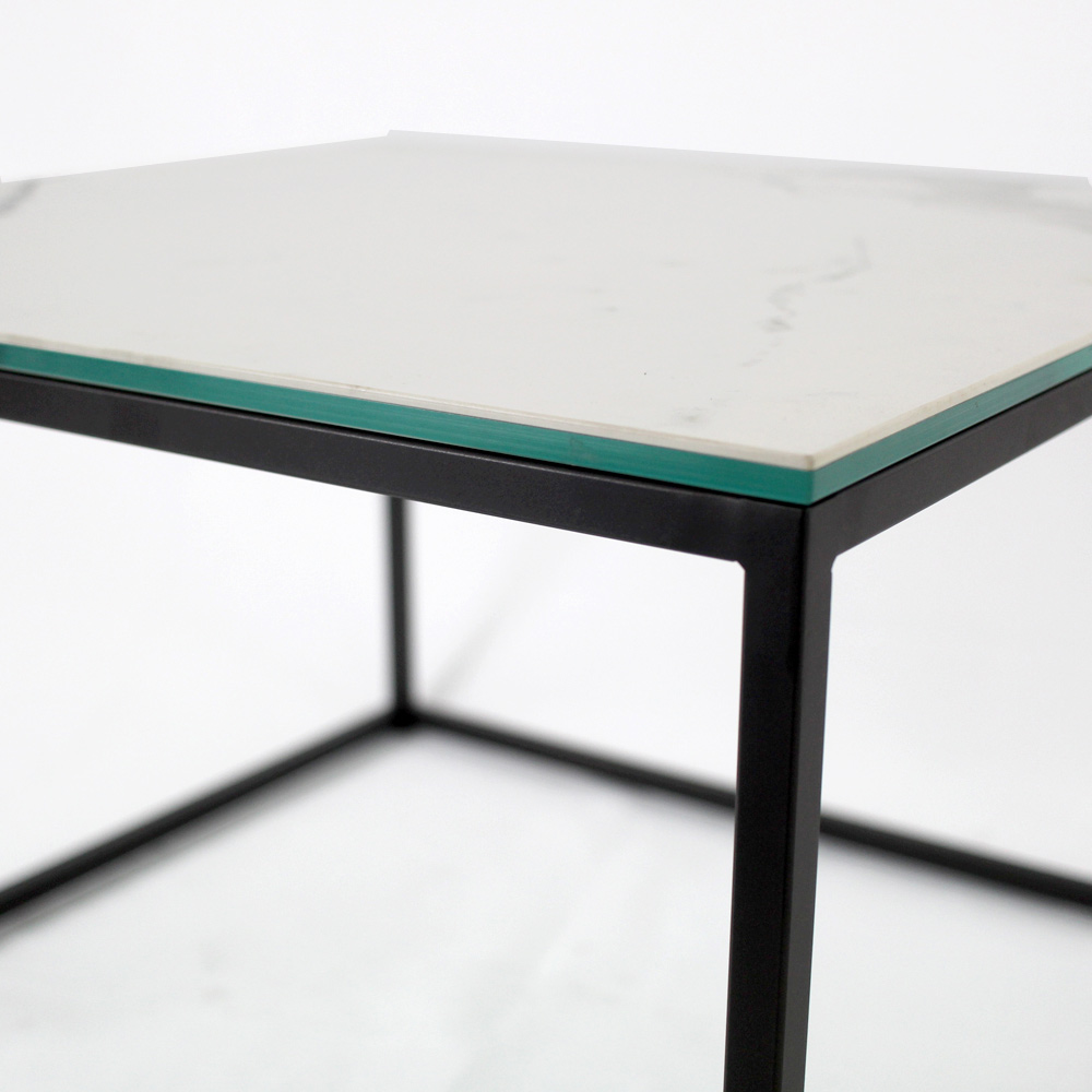 Masuta de cafea patrata cu baza din otel vopsit si blat din gresie albă statuară cu nervuri mate de 3 mm laminată cu sticlă float de 6 mm. Masutele de cafea in stil modern reprezinta piesa de mobilier perfecta pentru a completa decorul oricarui living si living. Aceste produse sunt unice, elegante si functionale in acelasi timp datorita finisajelor lor simple si armonioase care le fac potrivite pentru orice nevoie si ocazie de utilizare. Materialele folosite pentru constructie garanteaza o calitate si rezistenta mare chiar si cu trecerea timpului.