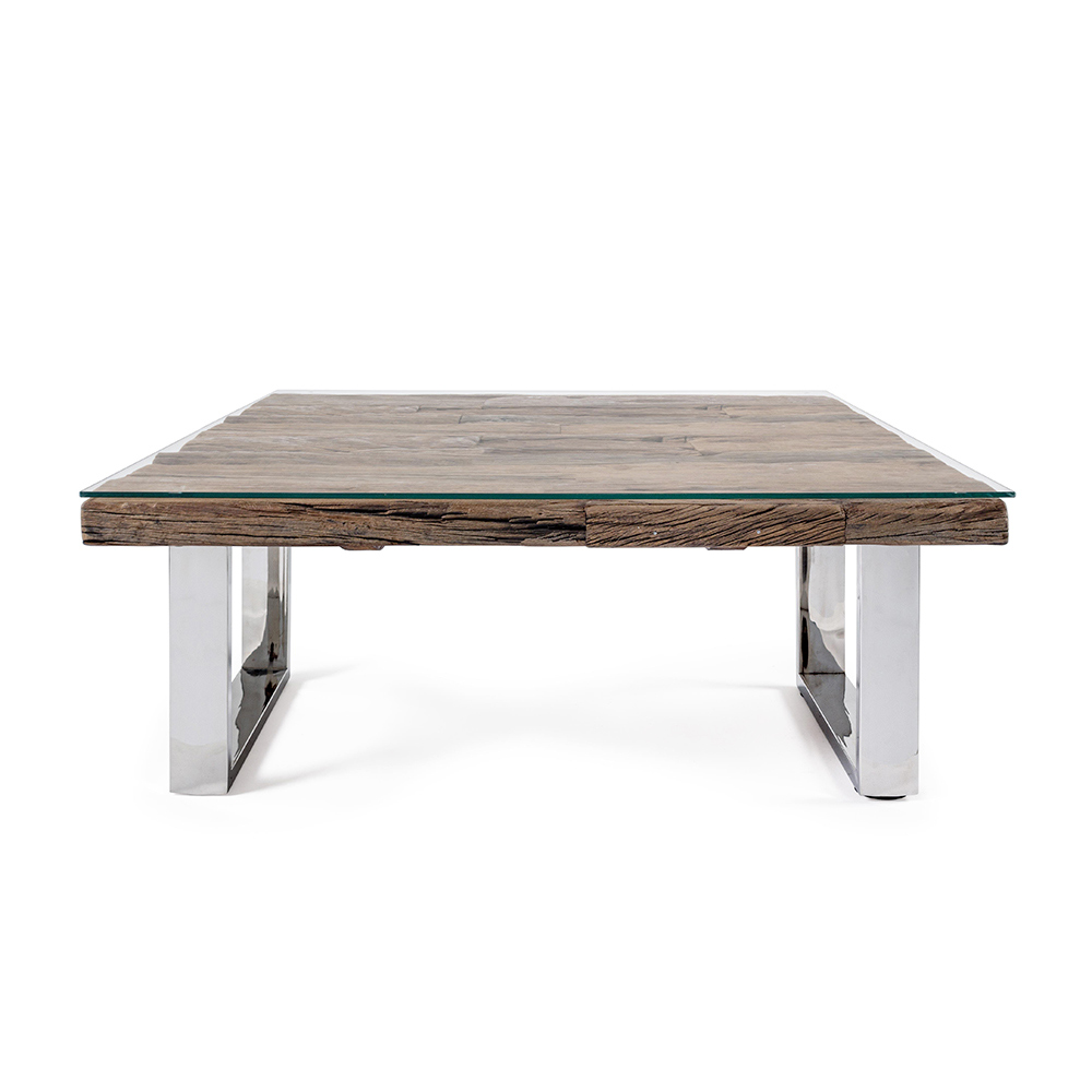 Masuta de cafea din lemn reciclat si sticla, picioare din otel.