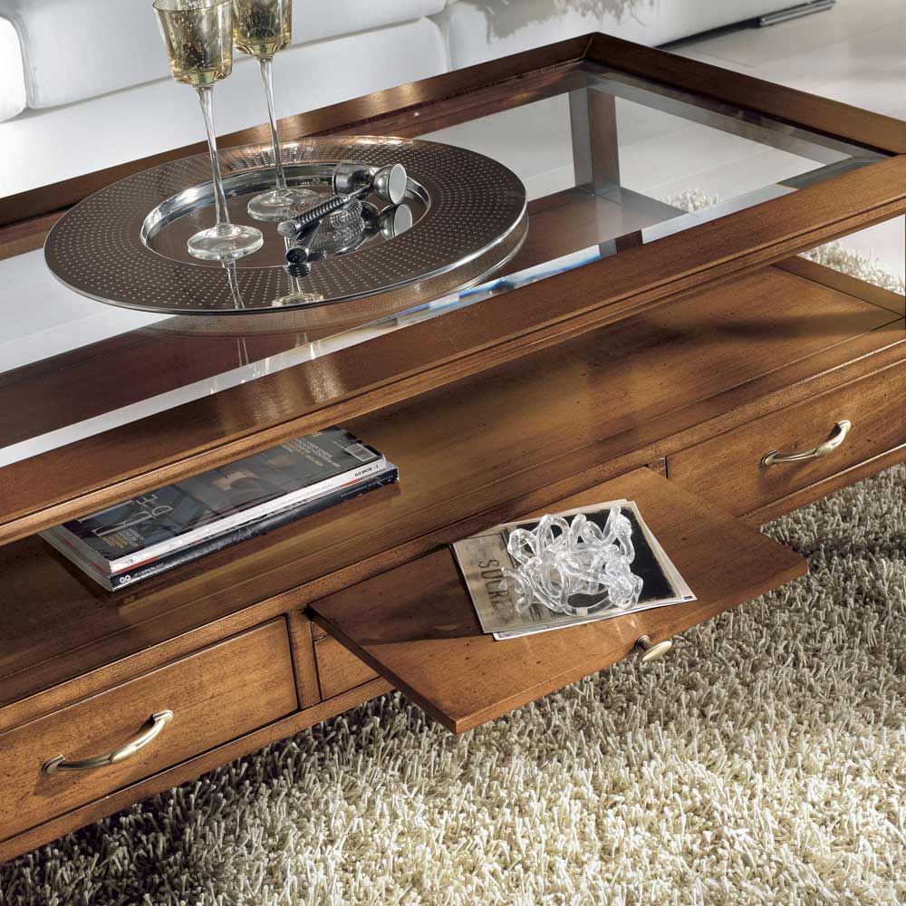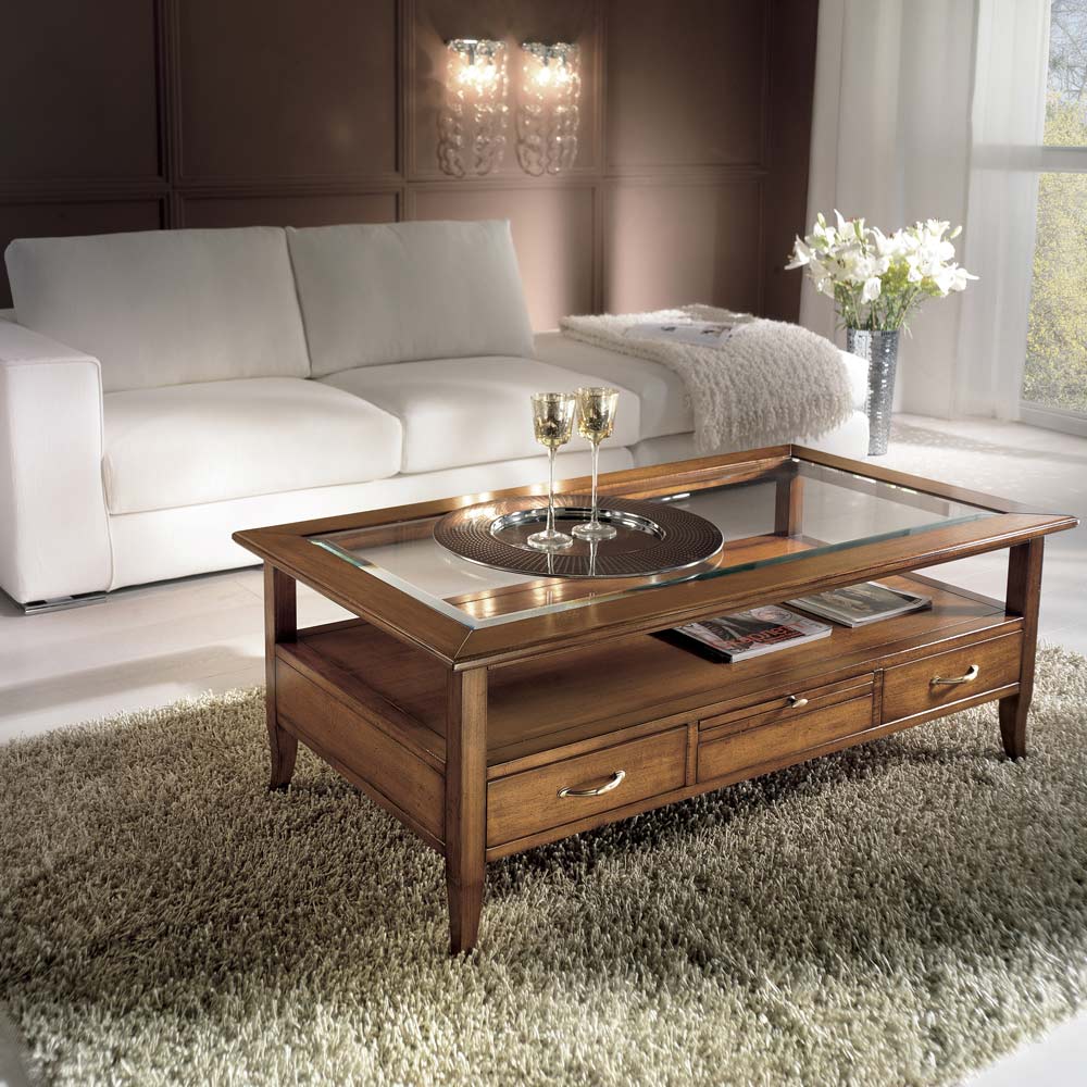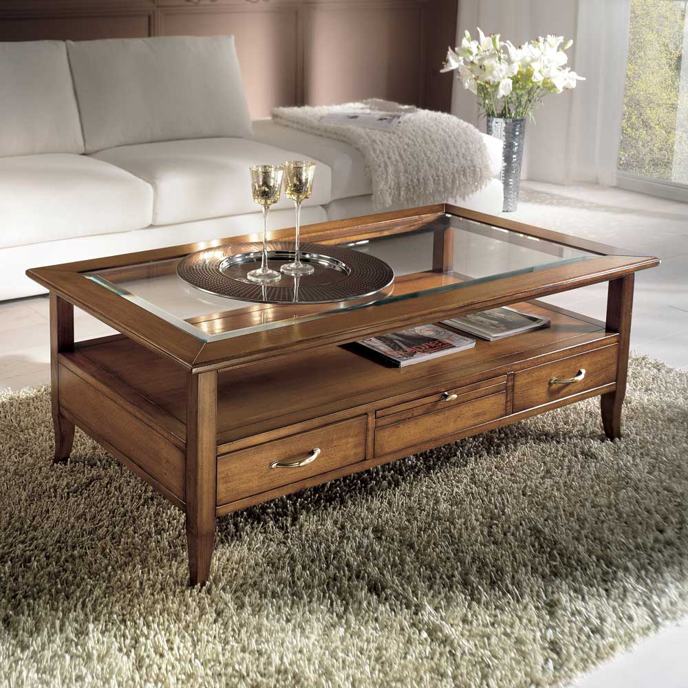 Masuta de cafea de interior cu structura din lemn si blat din sticla cu