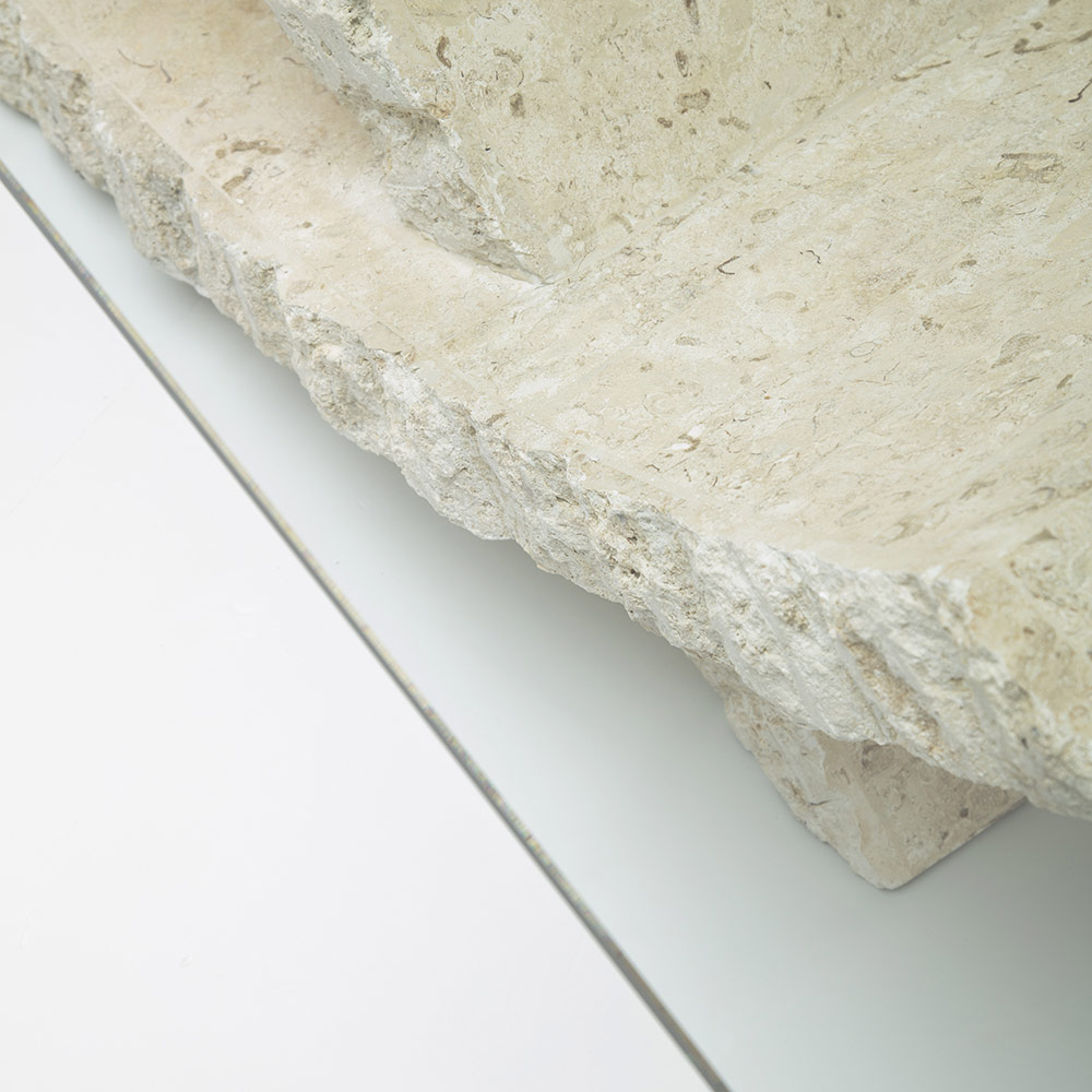 Masuta de cafea are un design original si inovator. Fabricat cu o structură din piatră fosilă cu finisaj alb și blat din sticlă lustruită de 10 mm.