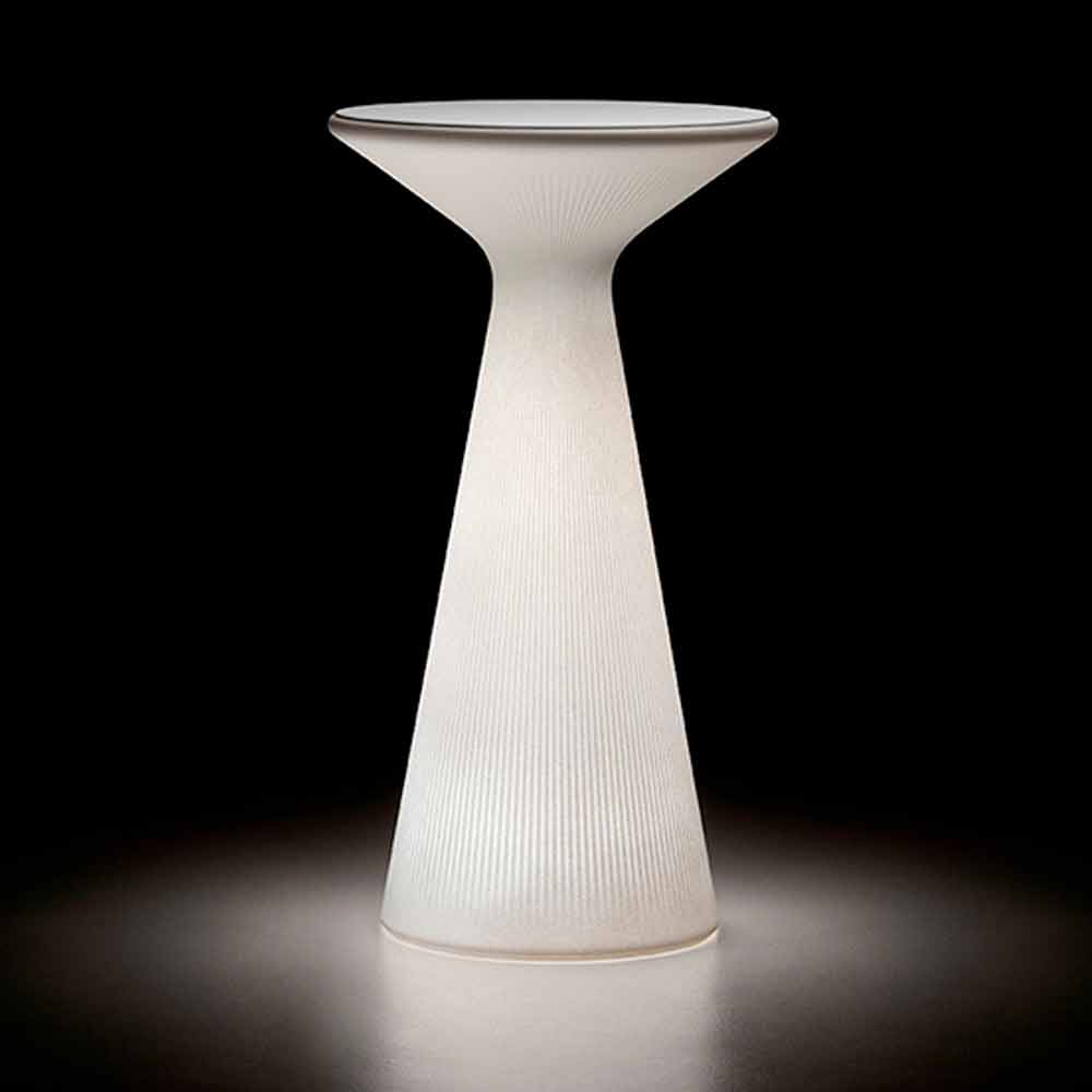 Masa rotundă de cafea în aer liber realizate în Italia , cu structura de polietilenă și de top HPL alb. Simplitatea și funcționalitatea disting această masă înaltă modernă ideală pentru a fi utilizată ca o suprafață practică de susținere, dar în același timp capabilă să joace un rol pur decorativ datorită designului său inovator și original. Suprafața specială cu dungi care acoperă întreaga bază a produsului face ca estetica mesei de cafea să fie interesantă, îmbogățită de lumina LED RGB care, iluminând structura, dă viață atmosferelor ideale pentru a petrece seri minunate în companie în spații domestice, cum ar fi grădinile și terase, dar și în medii contractuale în care este necesar să se găsească o soluție de amenajare care să fie la fel de funcțională pe cât de atrăgătoare din punct de vedere estetic.