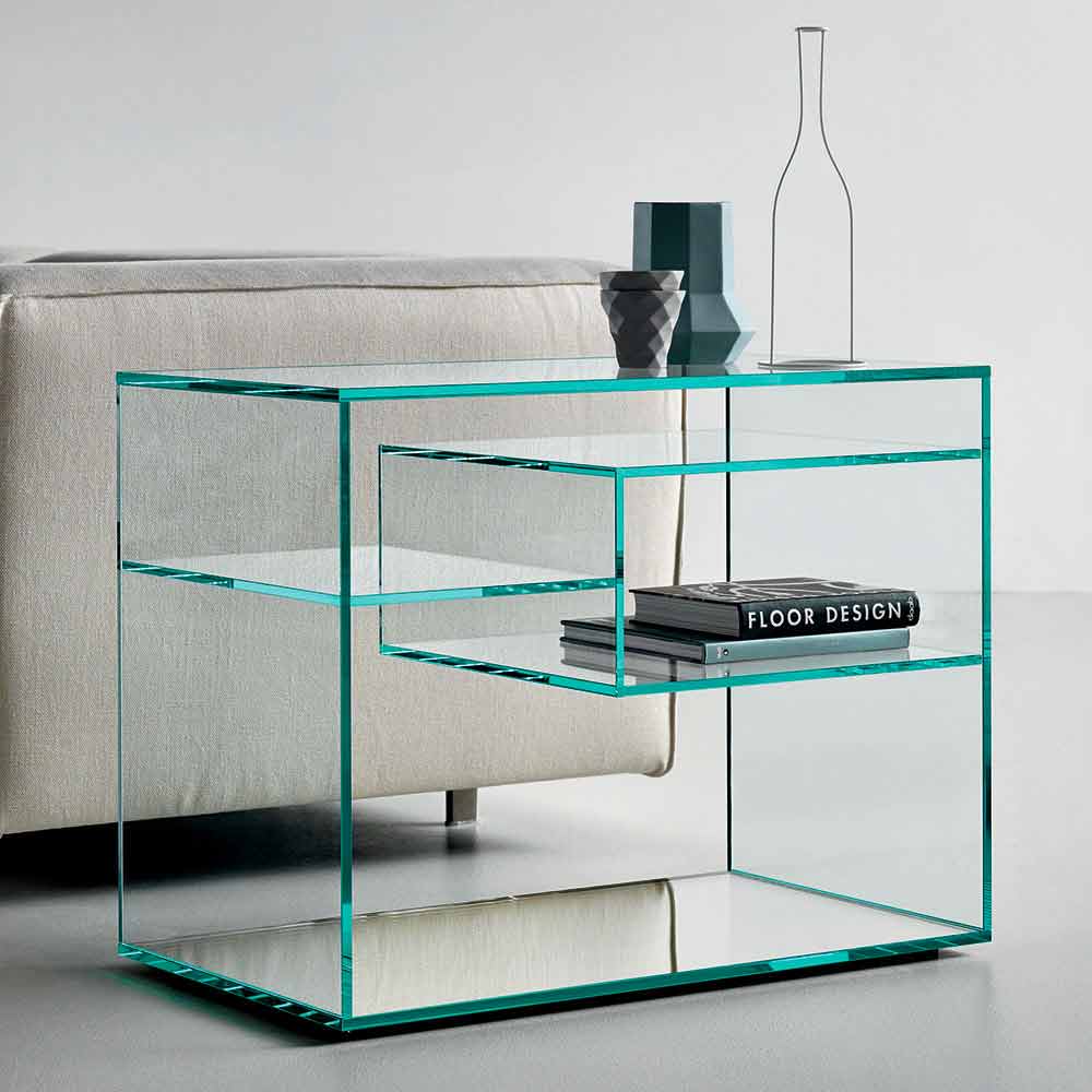 Această măsuță pentru canapea sau noptieră se caracterizează prin designul său versatil , elegant și minimal, realizat în întregime din sticlă extra-clară cu bază de oglindă.
