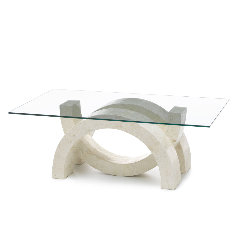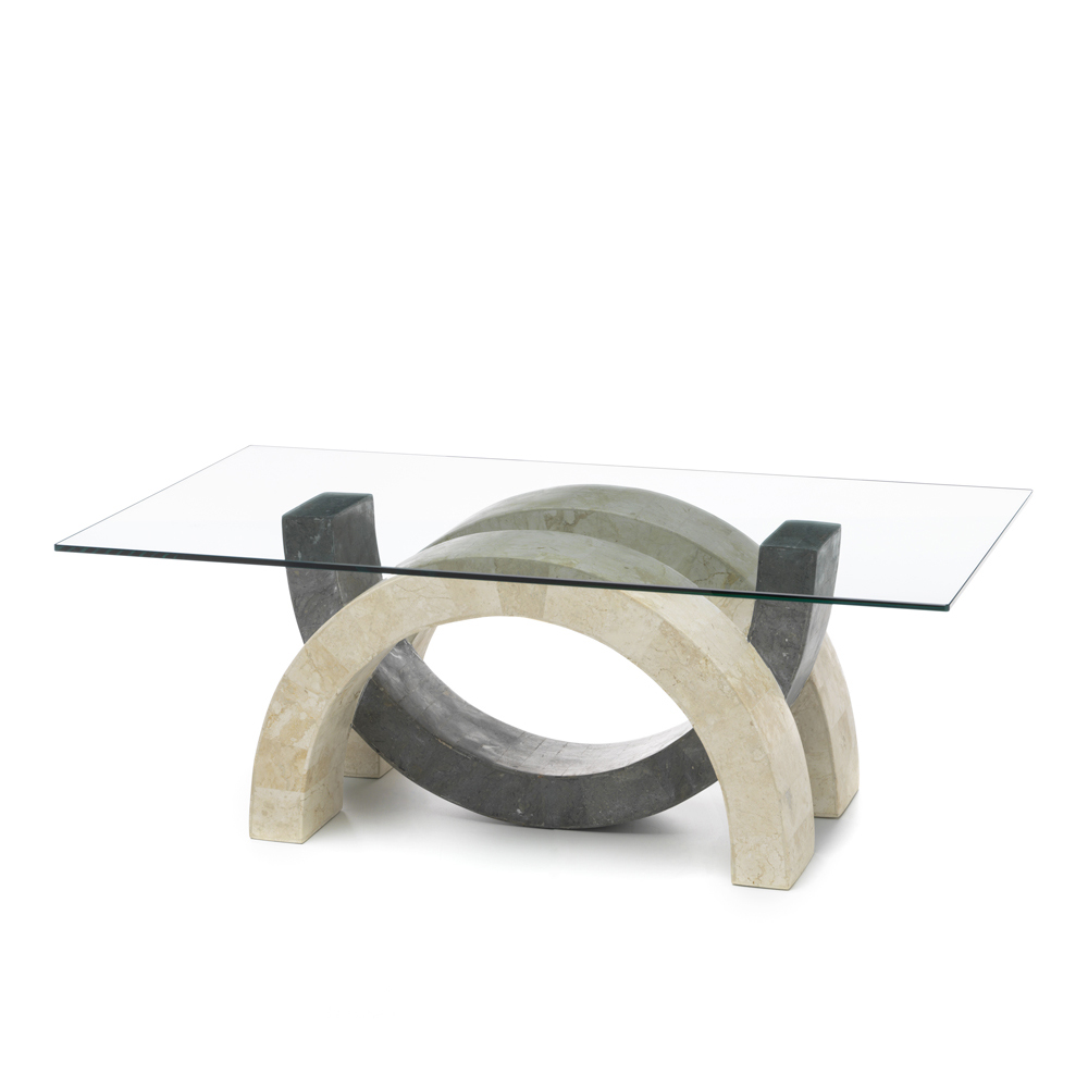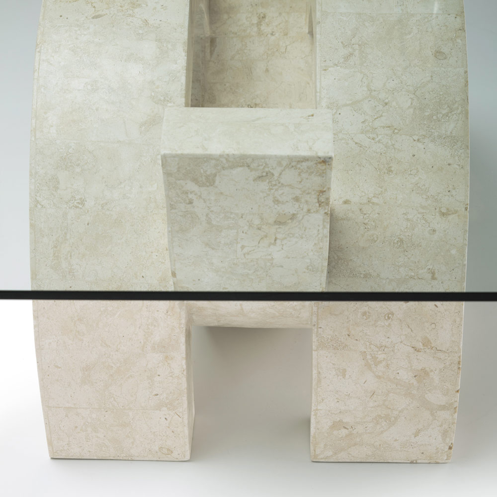 Clasicismul și modernitatea se îmbină în măsuța de cafea Austin , creând un contrast stilistic extrem de interesant. Ușurința sticlei permite structurii de piatră fosilă care o susține să strălucească: o împletire robustă, dar dinamică a liniilor rotunjite.