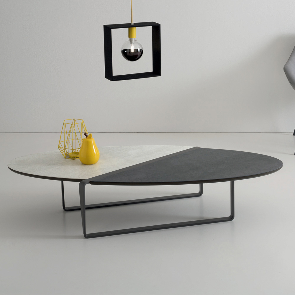 Această măsuță de cafea cudesign ovalare o bază metalică acoperită cu pulbere de grafit în relief și un blat din ceramică mat în două tonuripe panou. Caracteristica particulară a complementului este dată de blatul realizat din piatră antracit de savoia și piatră perlată de savoia. Un finisaj dublu pentru iubitorii de lumină și culoare. Structura metalică separă și unește cele două jumătăți în același timp într-un joc de contraste care dă viață și caracter zonei înconjurătoare.