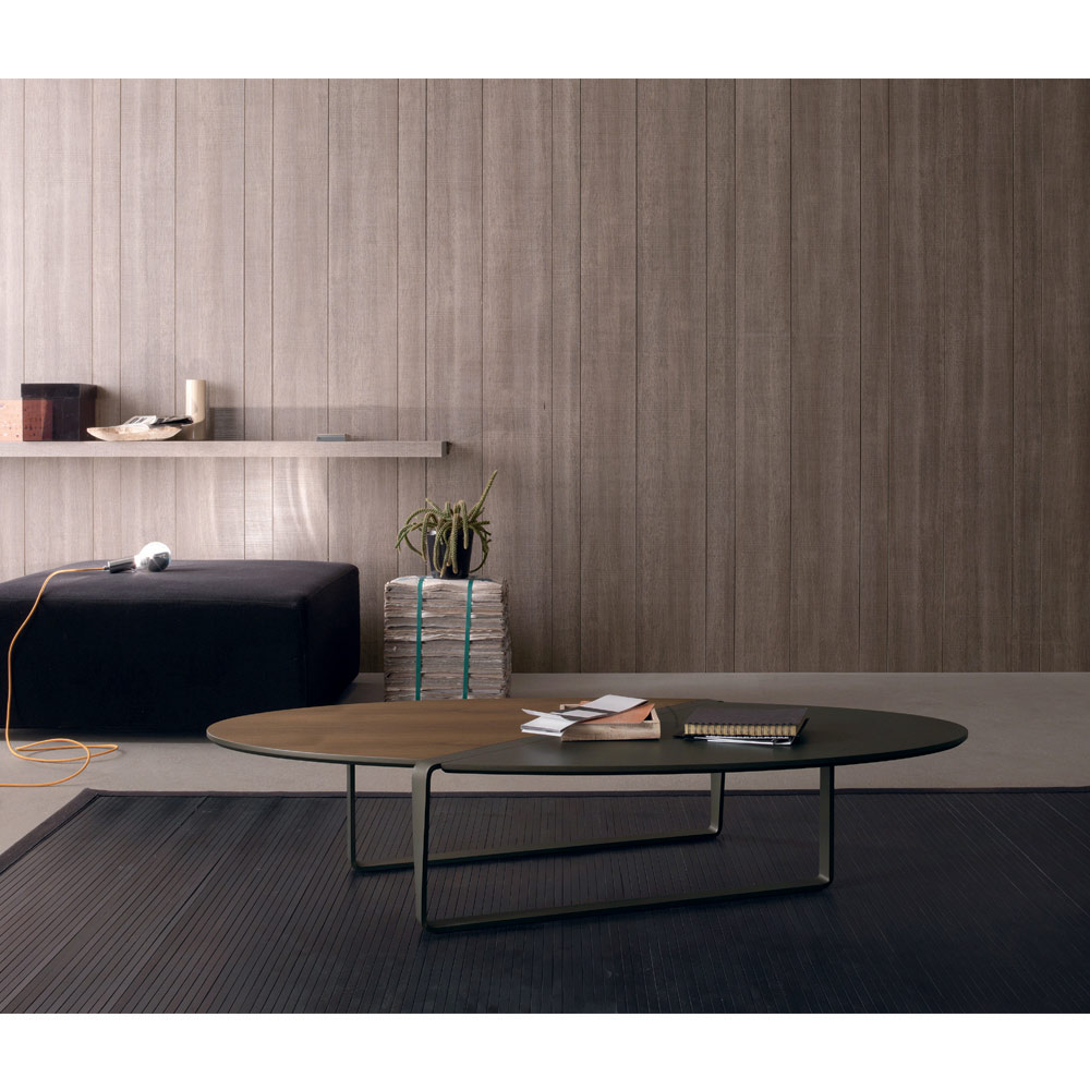Această măsuță de cafea cudesign ovalare o bază metalică vopsită cu pulbere de grafit în relief și un blat din lemn în două tonuri din furnir de nuc canaletto și lemn lacuit cu bronz metalic . Caracteristica particulară a complementului este dată de blatul realizat în două finisaje pentru iubitorii de lumină și culoare. Structura metalică separă și unește cele două jumătăți în același timp într-un joc de contraste care dă viață și caracter zonei înconjurătoare.