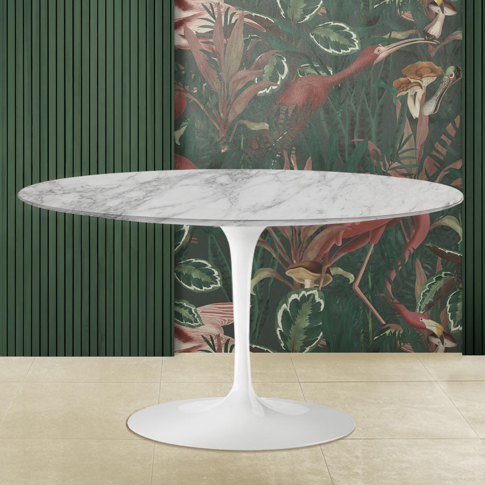 forma ovală neobișnuită și marmura arabescă folosită pentru blat oferă o notă de