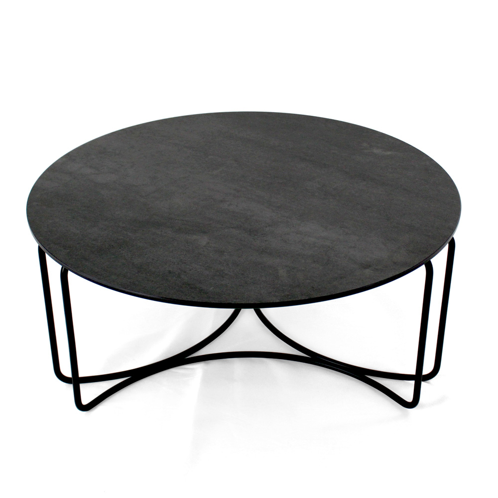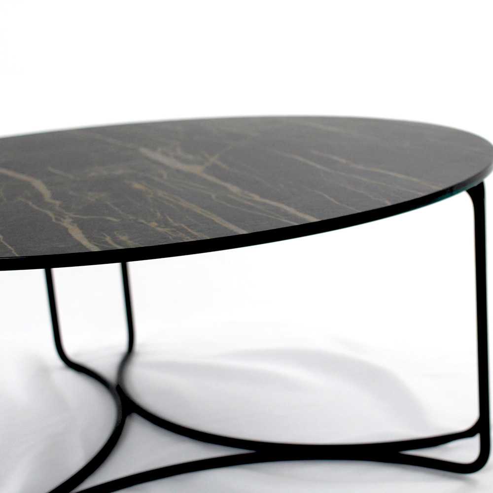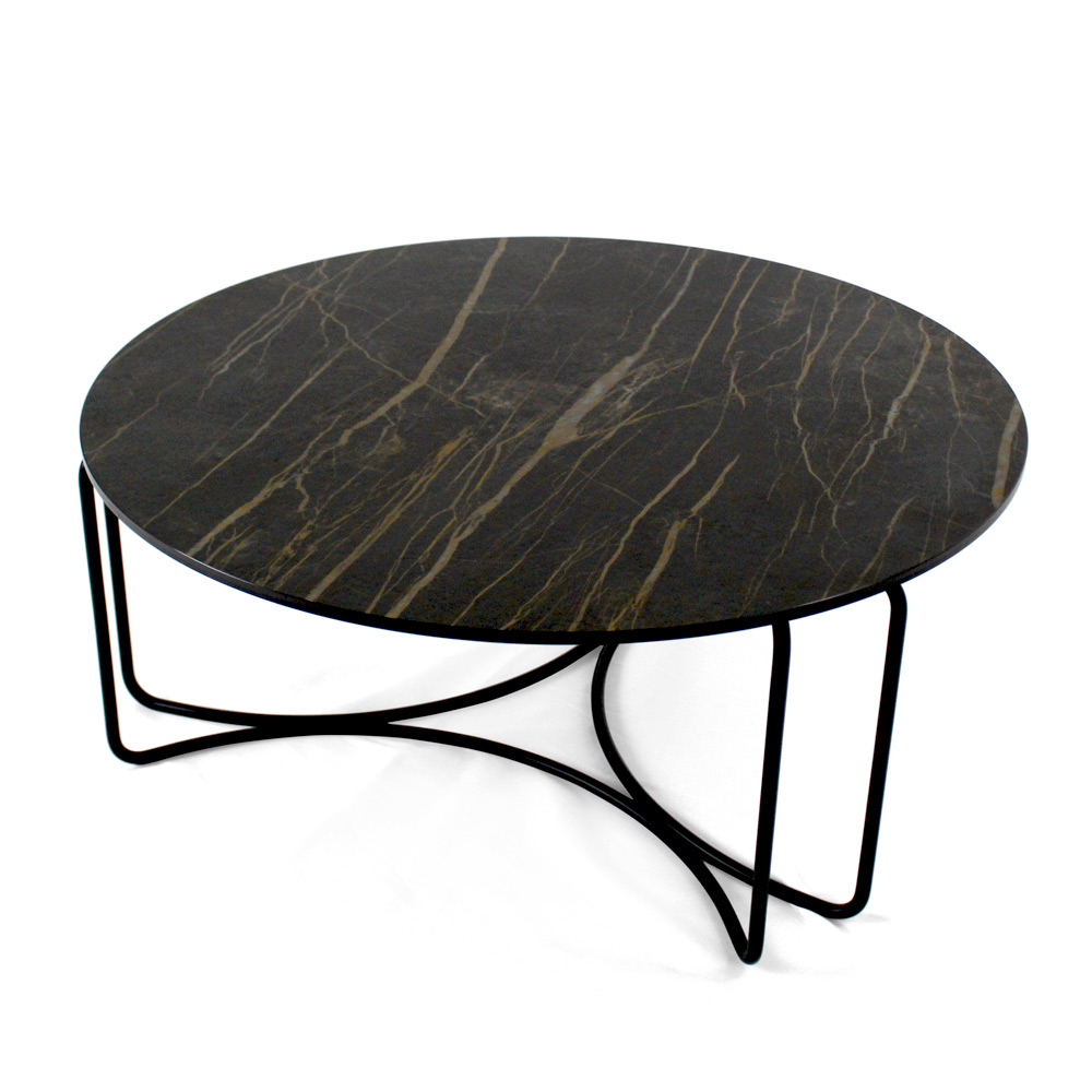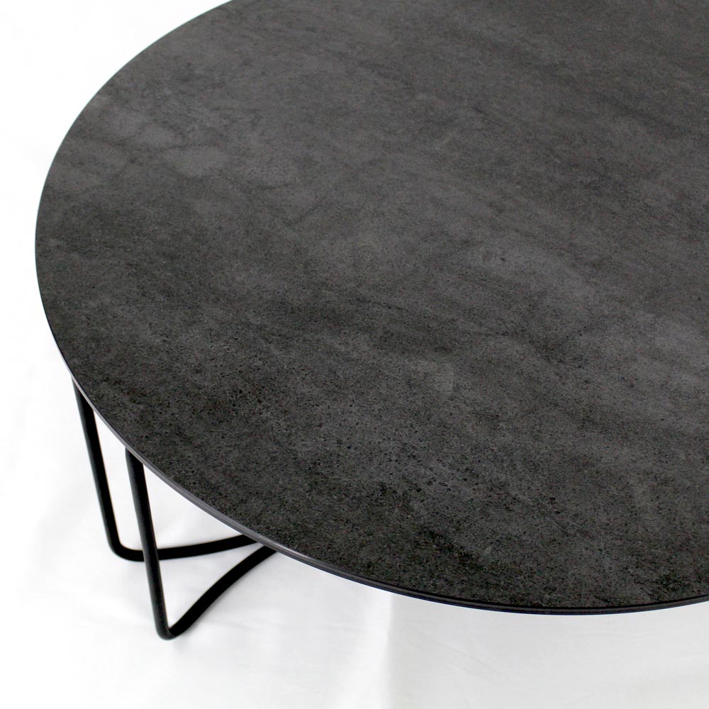 Masuta de cafea rotunda cu baza din otel vopsit si blat din gresie portelanata.