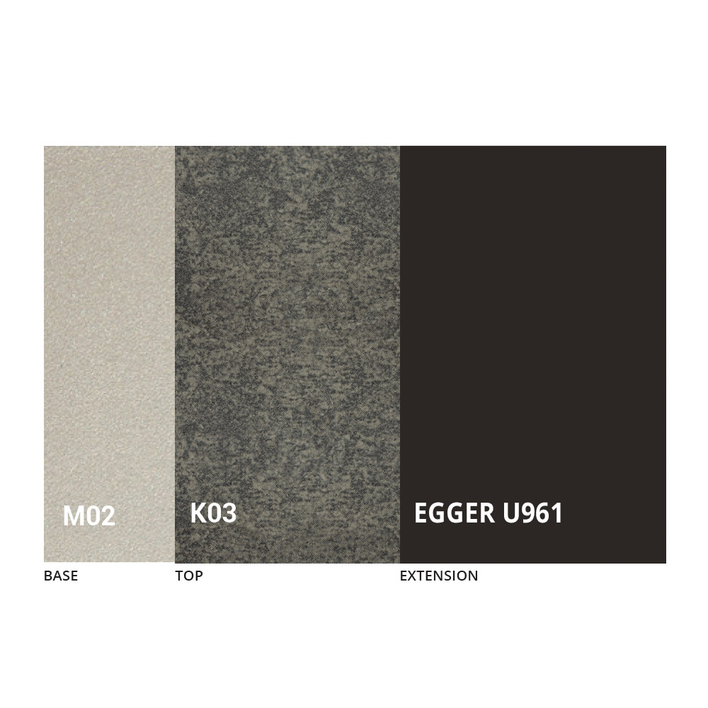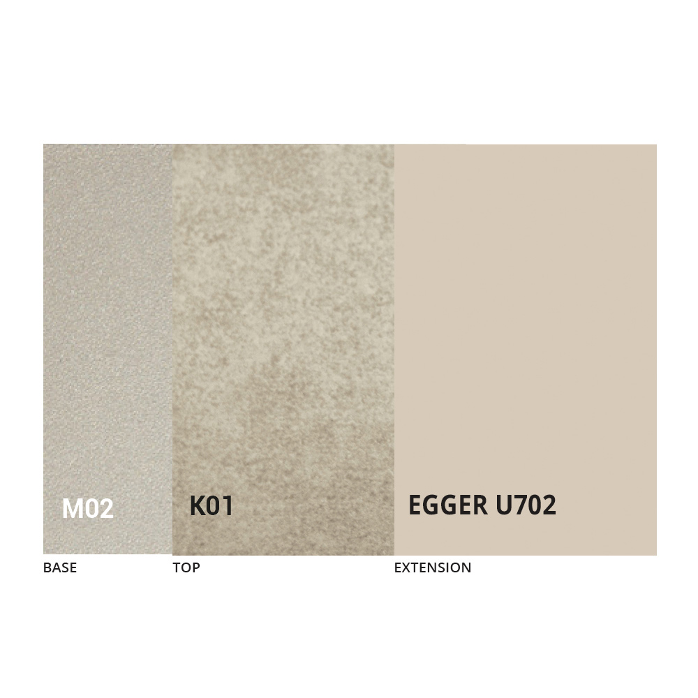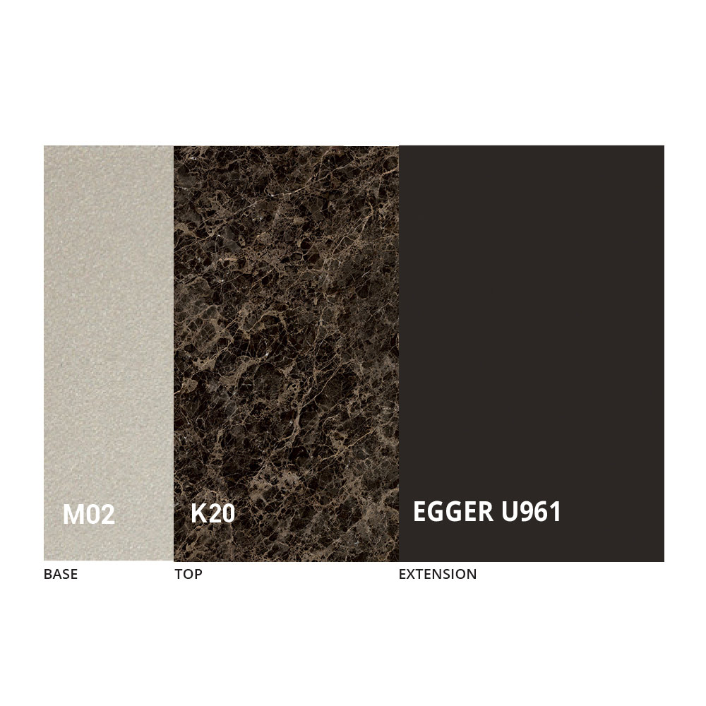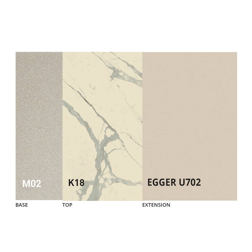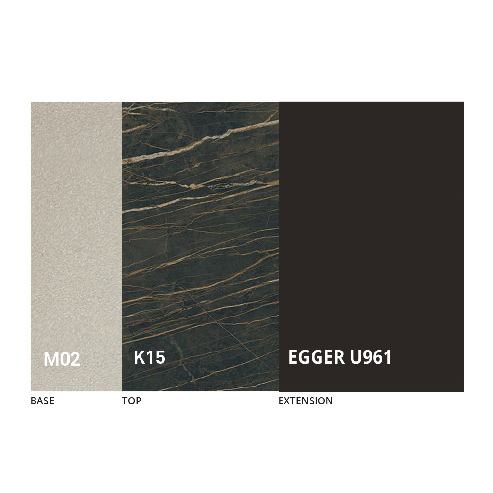 Blatul este disponibil în melamină, ceramică mată, sticlă și efect mortar într-o gamă largă de finisaje.