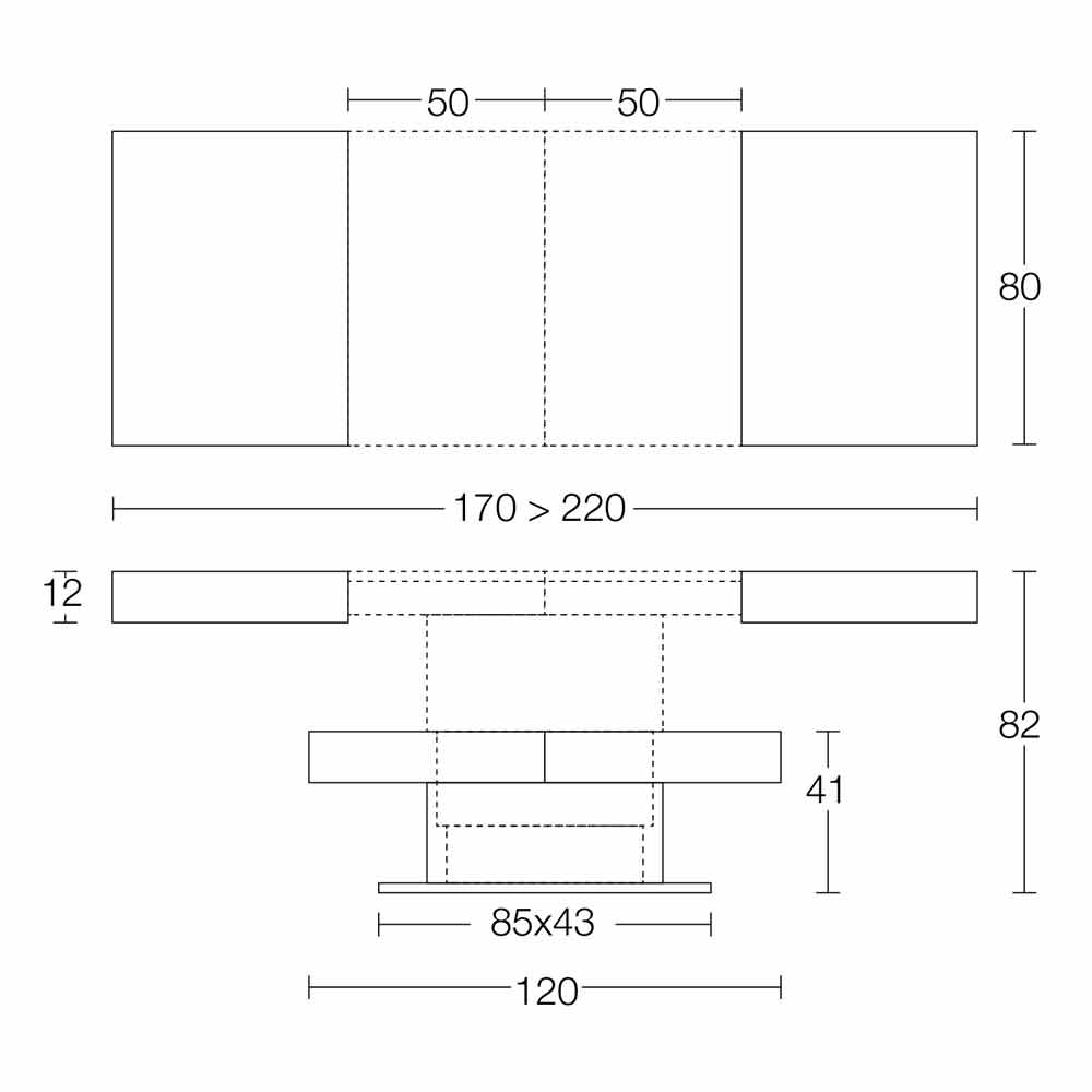 Blatul este dreptunghiular și extensibil prin două prelungiri (interne) de 50 cm fiecare și este capabil să se transforme într-o masă de sufragerie datorită mecanismului cu gaz care reglează înălțimea la milimetru: de la 41cm la 82cm.