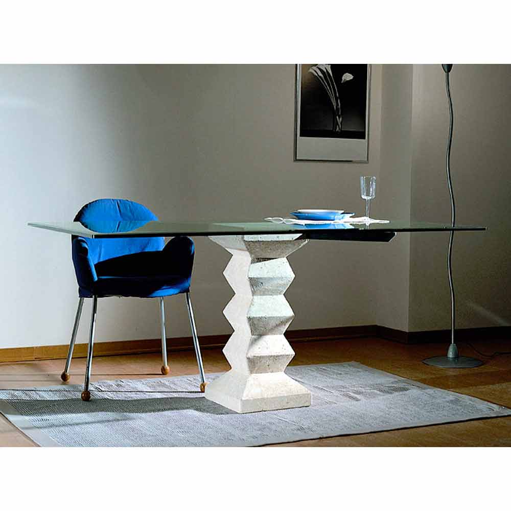 Masă de masă dreptunghiulară modernă Realizată în Italia cu bază centrală din piatră naturală Vicenza , mână sculptată de blocul solid și cu vârf de sticlă flotată de 15 mm, susținută de o bară metalică brută perforată și lăcuită.