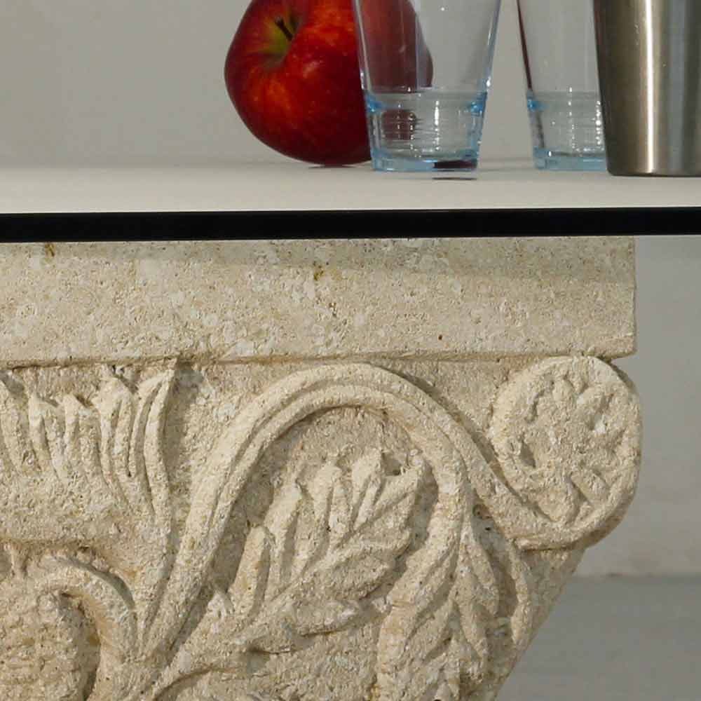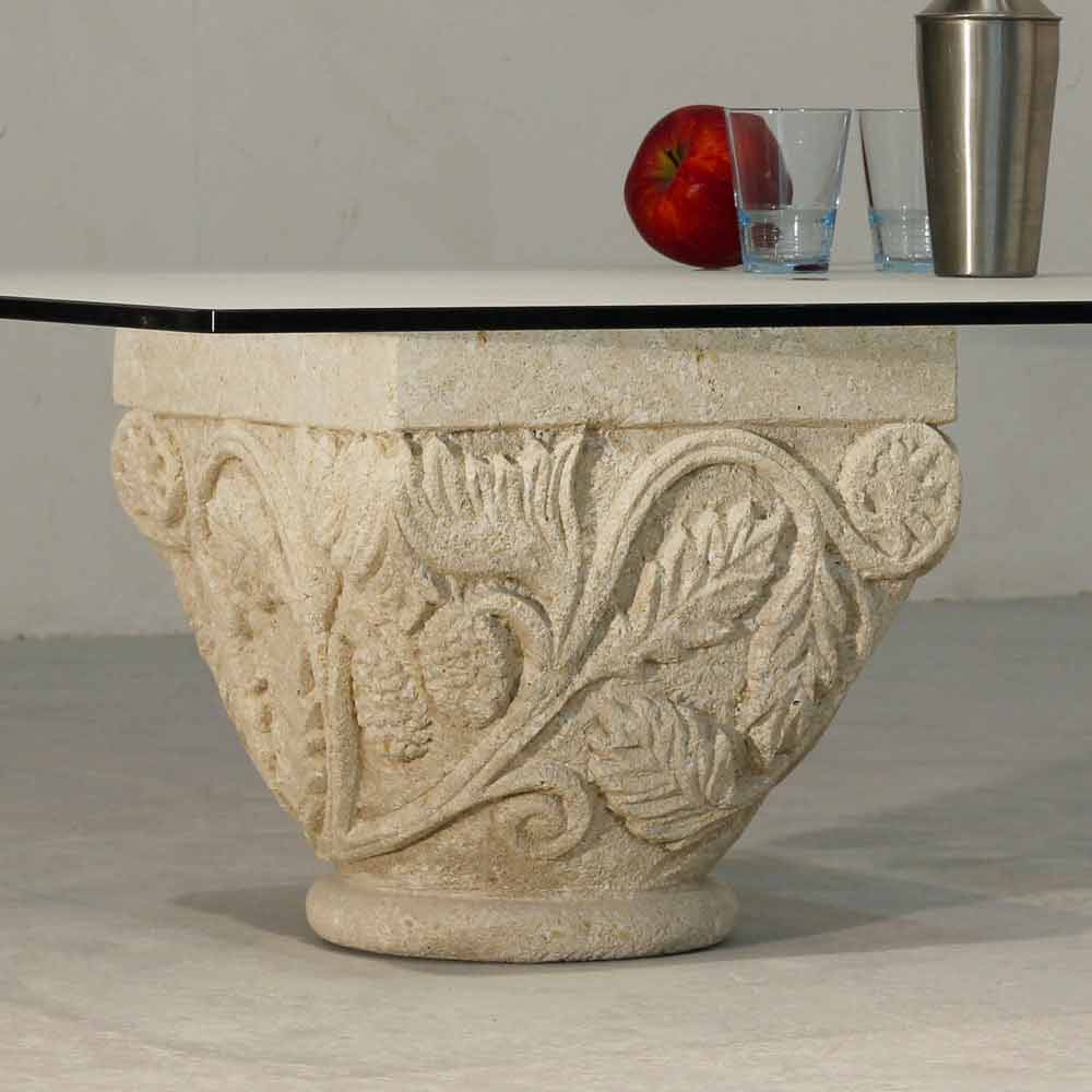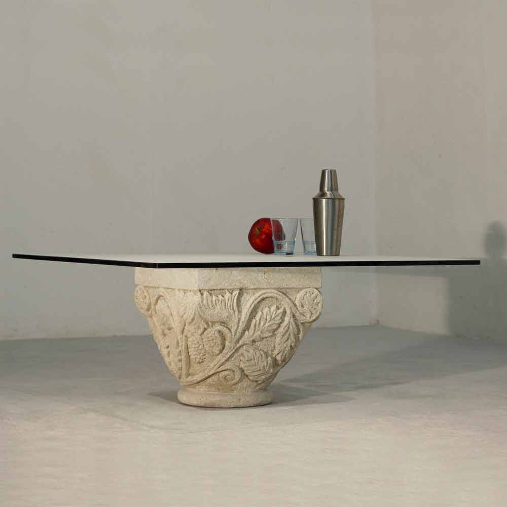 Mese de pătrat clasic Made in Italy cu bază centrală în piatră naturală Vicenza, sculptată manual de la blocul solid și cu un vârf de sticlă flotată de 12 cm, care se sprijină pe bază.