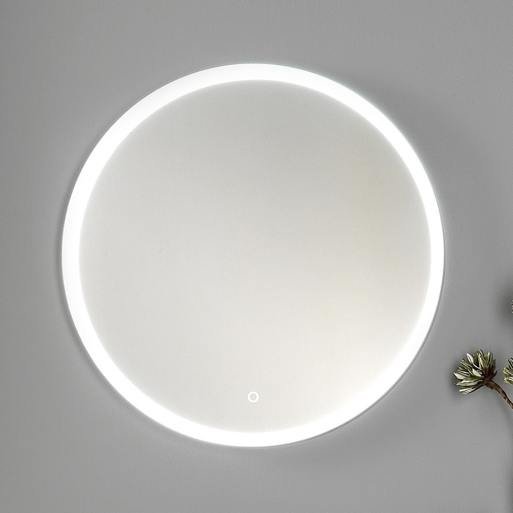 oglinda rotundă cu diametrul de 70 cm cu iluminare LED integrată și margine din metal vopsit în alb mat.