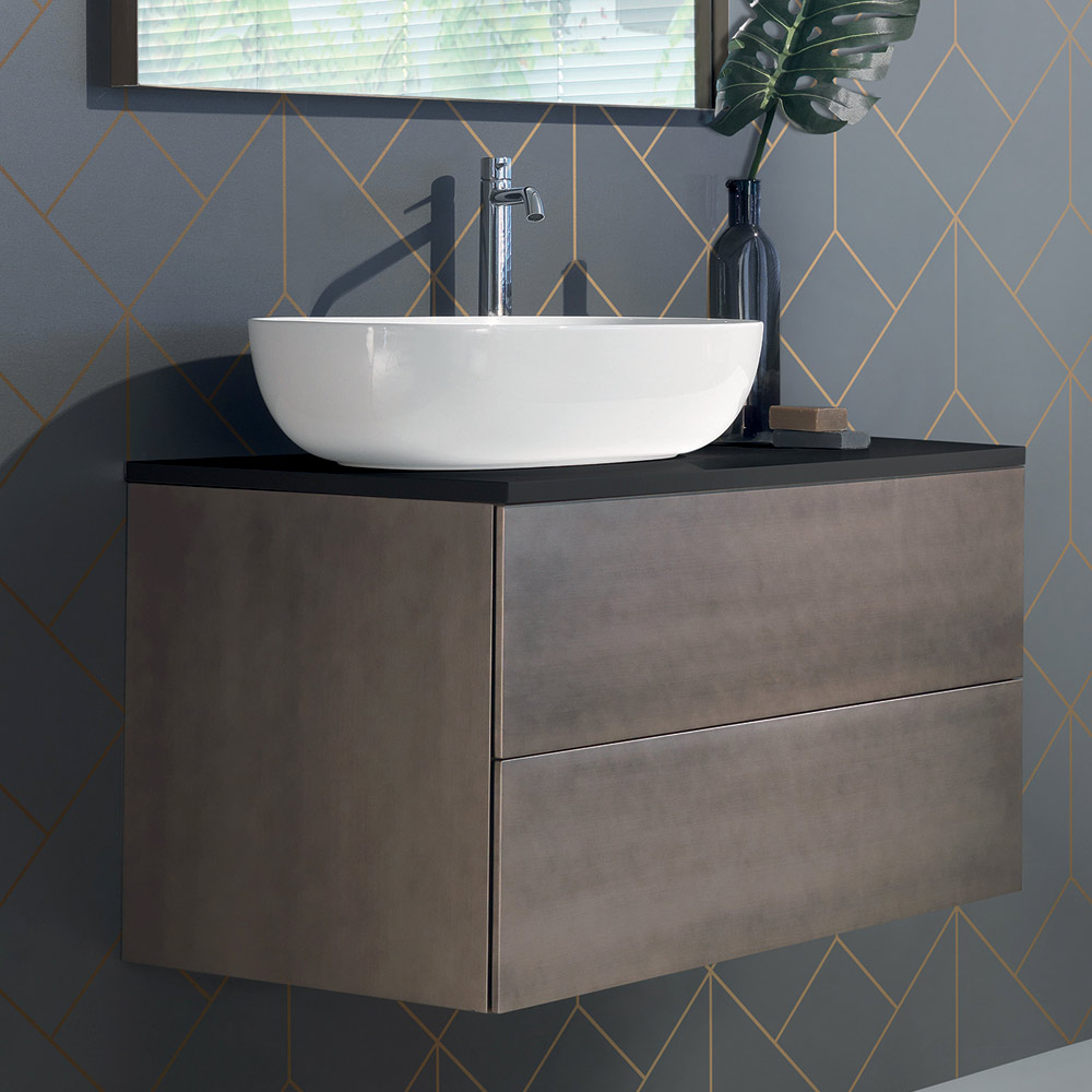 bază pentru chiuvetă cu 2 sertare din lemn MDF cu finisaj lăcuit de platină mată prețioasă mată și un blat din lemn lăcuit negru mat cu chiuvetă din ceramică albă.