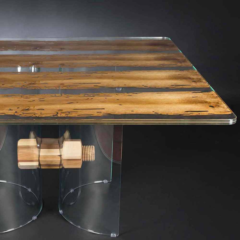 design simplu și elegant, în formă de pătrat și unic și inimitabil potrivite pentru orice tip de mobilier de masă. În ea lemnul de „Briccole“ și sticla se topesc într-o îmbrățișare caldă și indisolubilă. O caracteristică unică a acestui tabel rezidă în baza sa realizat din sticlă curbată unite printr-un șurub și o piuliță de design, realizate cu diferite lemn într-o prelucrare fină de cabinetry artizanale.