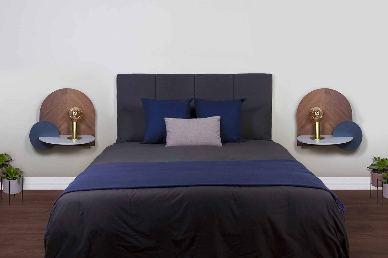 Această noptieră modulară reprezintă o idee inovatoare și originală capabilă să cucerească orice atenție din interiorul camerei datorită stilului său unic și combinației de materiale și finisaje care conferă eleganță și un design extrem de modern . Structura sa este alcătuită din 3 panouri de placaj , unul în finisaj din lemn de nuc și două în finisaj de frasin vopsit în albastru și gri . Panoul care acționează ca o suprafață reală de sprijin este fixat pe perete și pe acesta sunt montate cele 2 panouri modulare, care pot fi poziționate în 8 configurații diferite, obținând astfel un produs care poate fi personalizat în funcție de nevoile și spațiile proprii. Structura are, de asemenea, o gaură pentru cablu poziționată în spatele panoului frontal, permițându-le să fie ascunse și făcând noptiera și mai funcțională și mai practică. Între panourile verticale și perete există un compartiment de 9 cm care poate fi folosit pentru a stoca și organiza cărți și reviste sau orice alt obiect, optimizând la maximum spațiul disponibil.