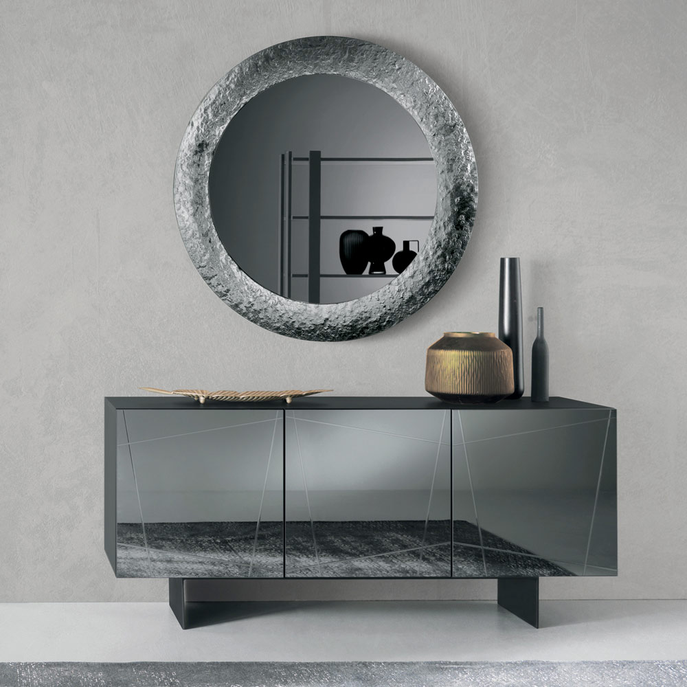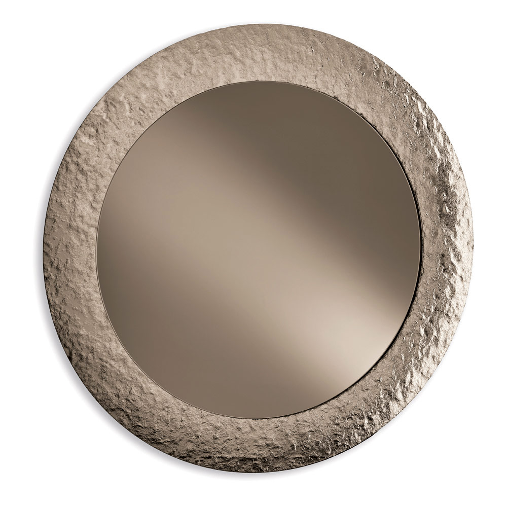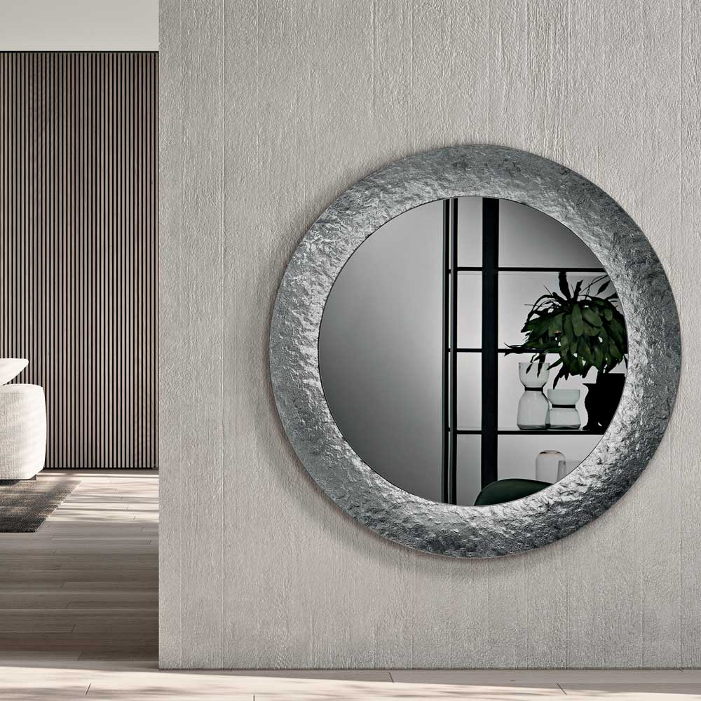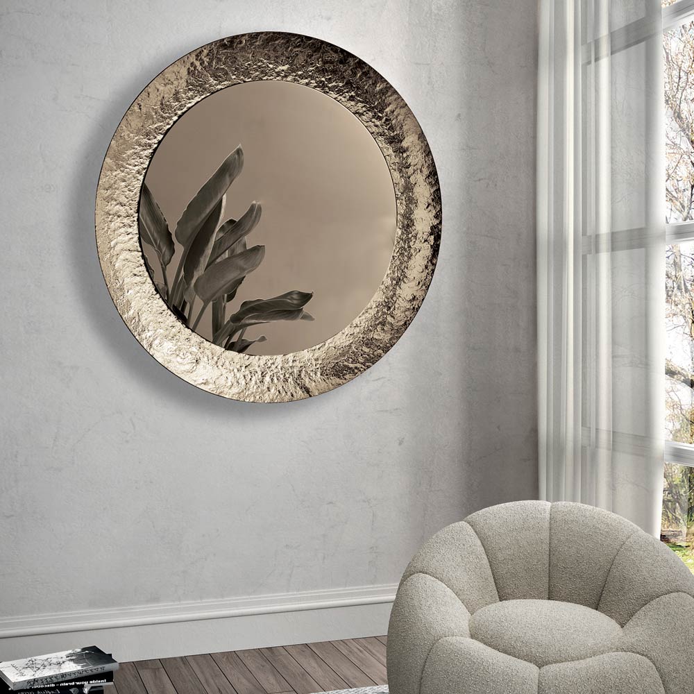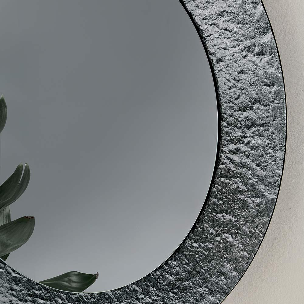 Oglinda are o formă circulară , înfrumusețată cu o ramă din sticlă ciocănită argintie pe spate, în nuanțe de culoare , conferă suprafeței o senzație vibrantă și texturată. Finisajul unic reflectă delicat lumina, creând o interacțiune elegantă ce îmbunătățește spațiul fără a fi intruzivă.