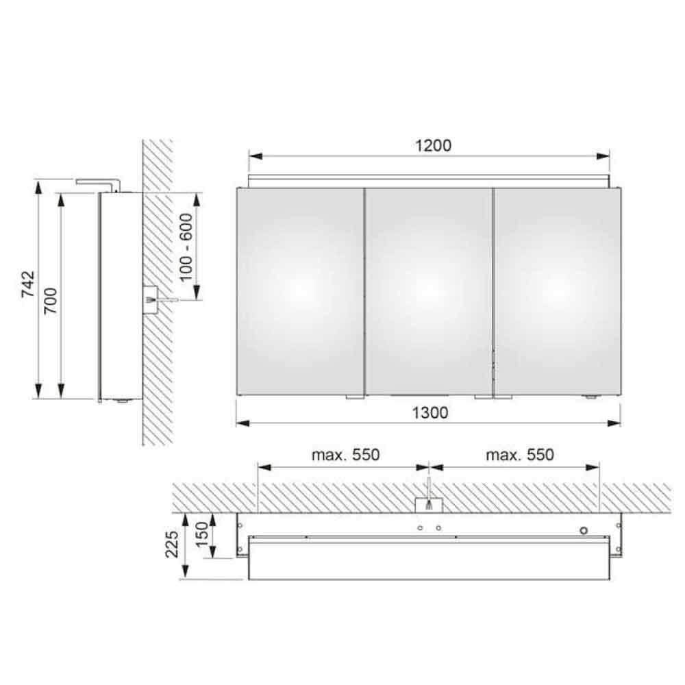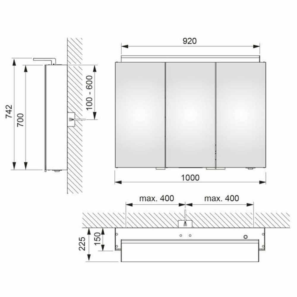 Oglindă container cu 3 uși articulate cu oglinzi (de asemenea, interne) și oglinzi laterale cu iluminare LED.