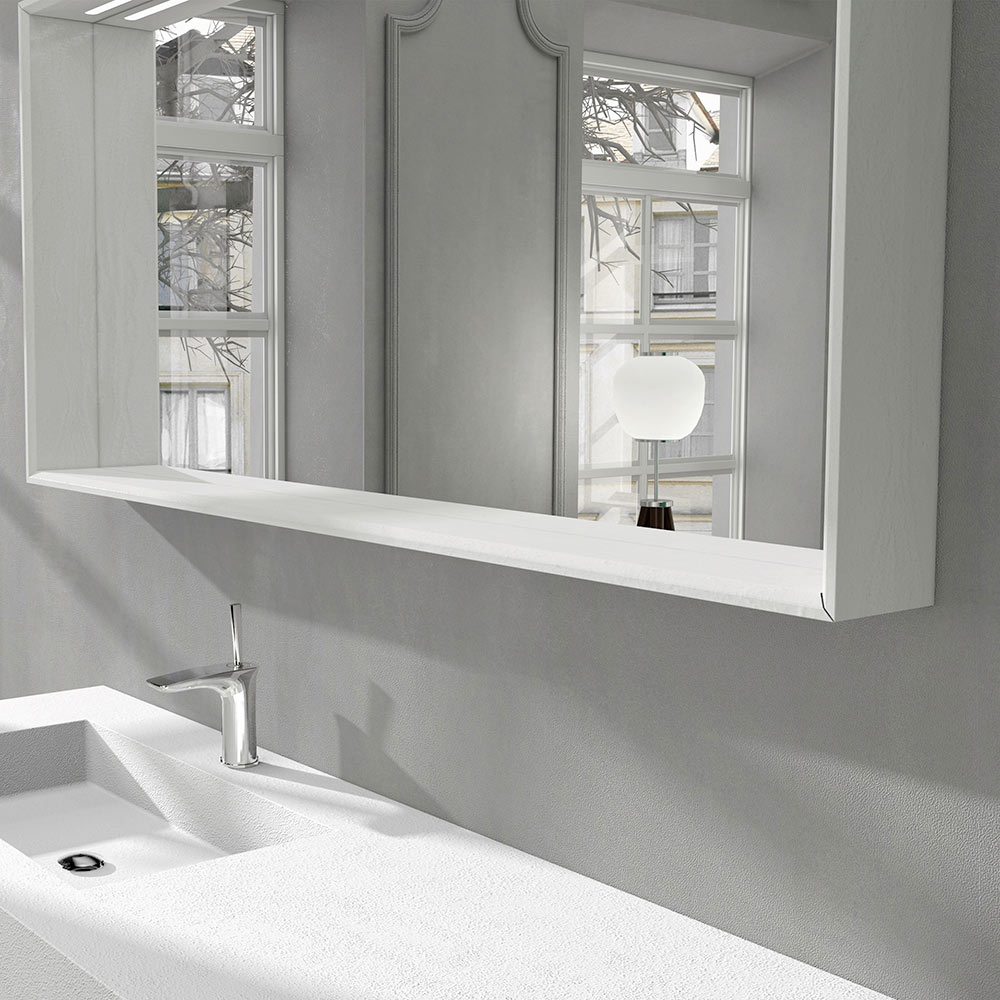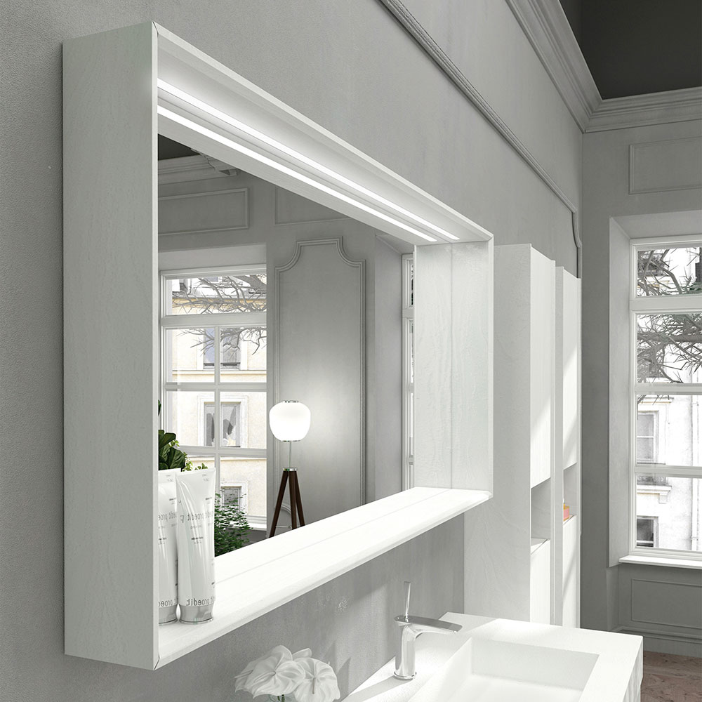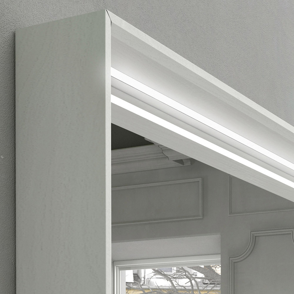 Oglindă de perete dreptunghiulară pentru baie cu lumină LED și margine din lemn alb, lux fabricat în Italia.
