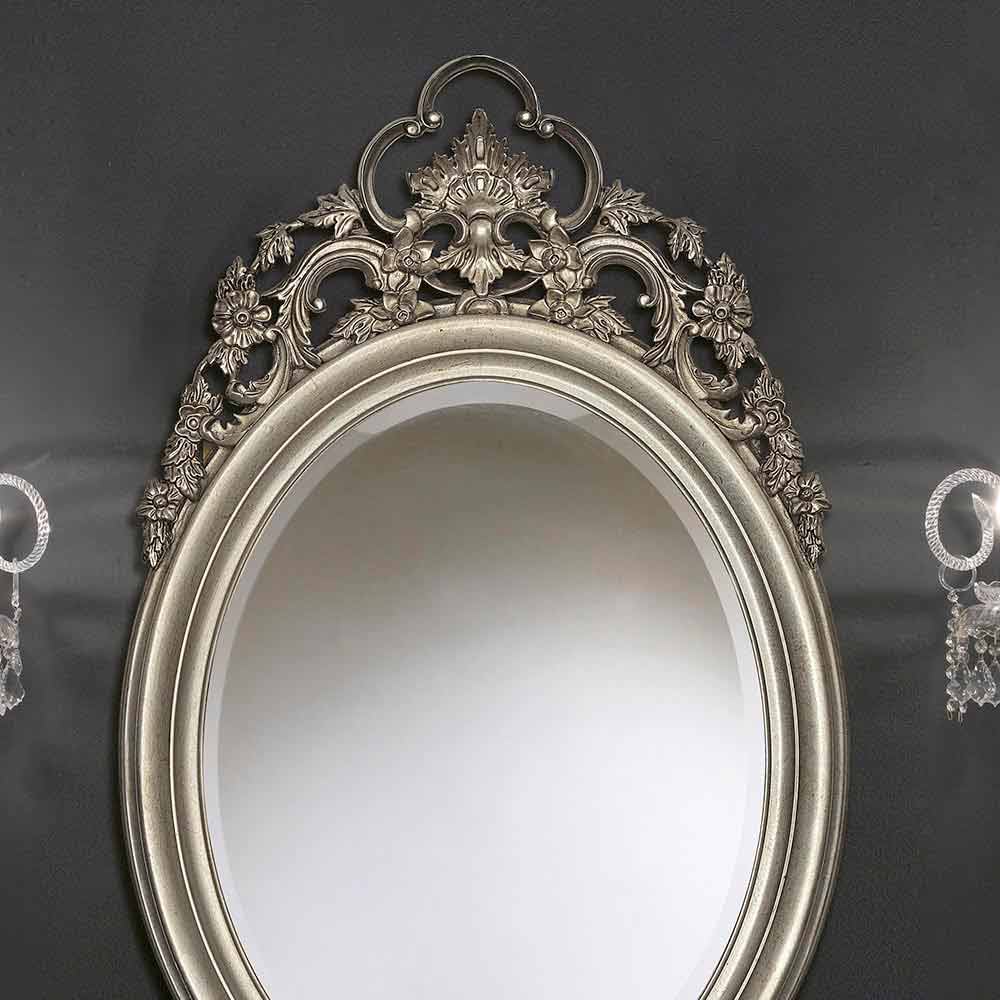 Designul său regal este acoperit cu un ornament complicat care încoronează oglinda, adăugând un punct de interes vizual și o senzație de înălțime și grandoare peretelui de care atârnă. Forma ovală a suprafeței reflectorizante oferă o viziune moale și primitoare, ideală pentru spațiile în care doriți să adăugați un sentiment de intimitate și rafinament.