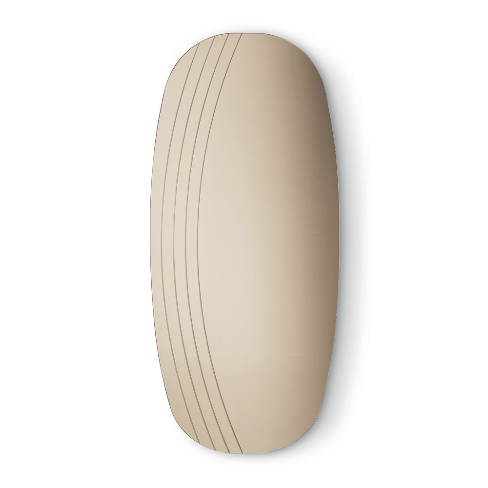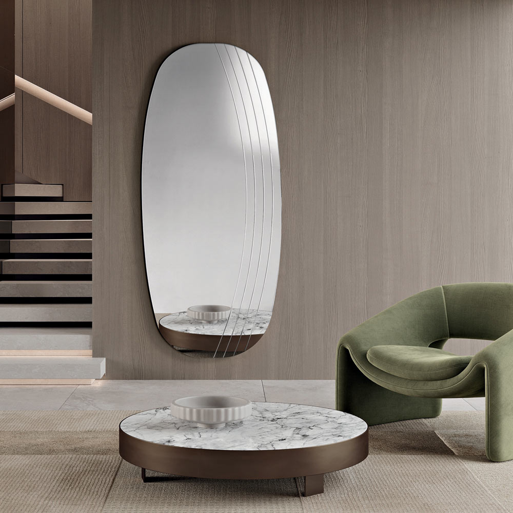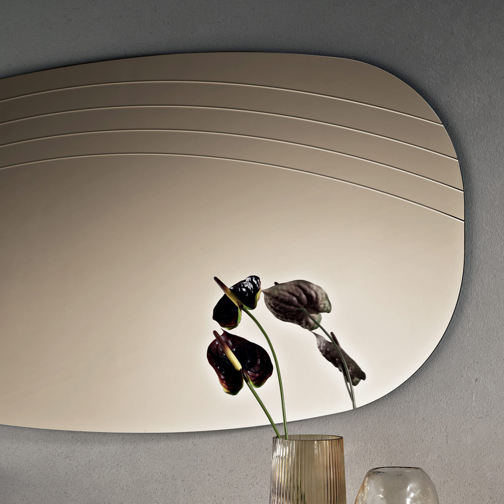 Suprafața reflectorizantă este accentuată de incizii laterale delicate care urmăresc profilul sinuos al oglinzii, creând un joc rafinat de lumină și textură. Acest detaliu decorativ adaugă profunzime vizuală și accentuează armonia formelor, conferind oglinzii un aspect sofisticat și modern.