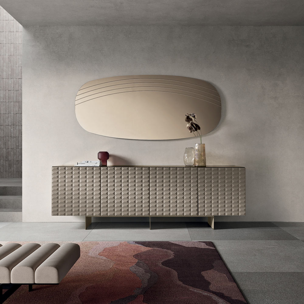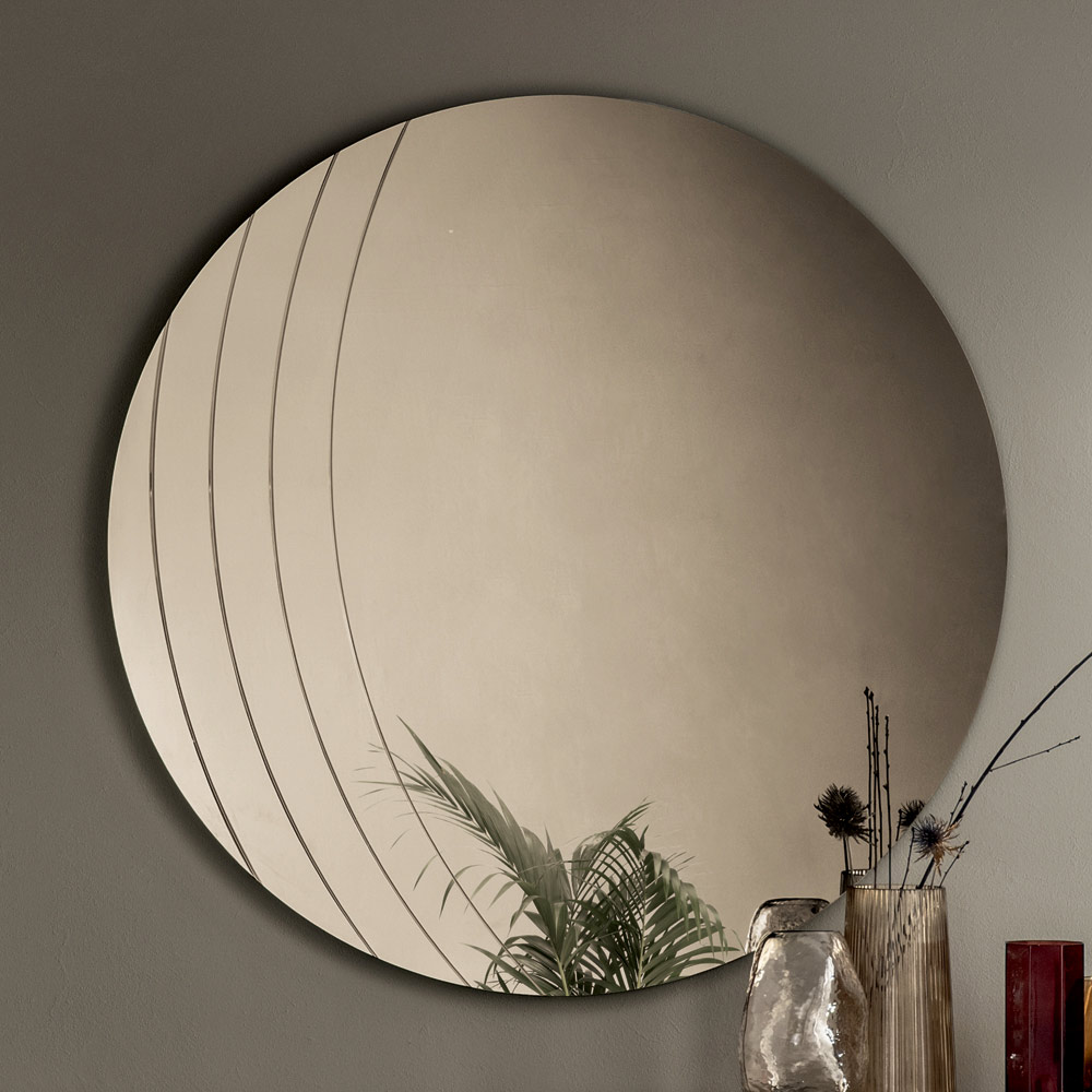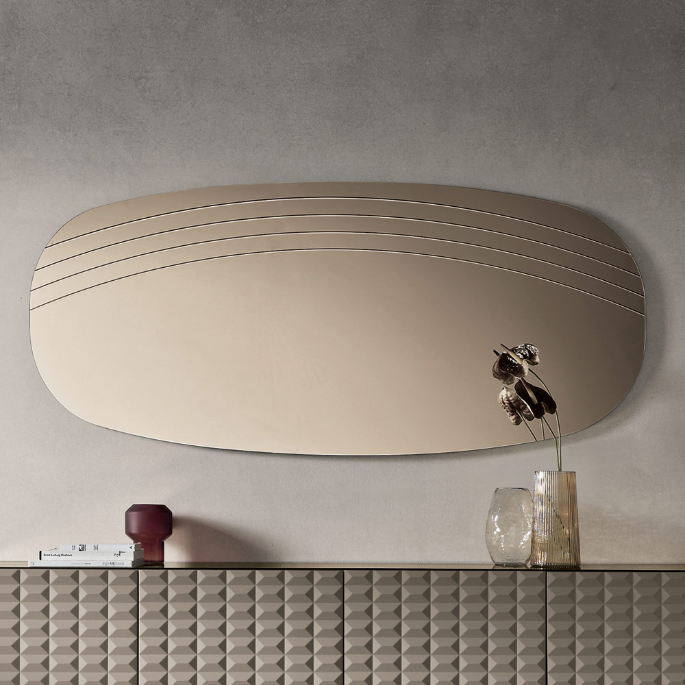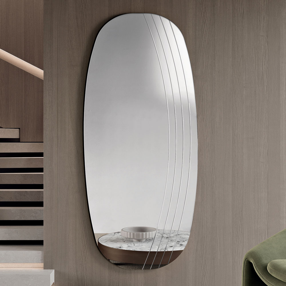 Suprafața reflectorizantă este accentuată de incizii laterale delicate care urmăresc profilul sinuos al oglinzii, creând un joc rafinat de lumină și textură. Acest detaliu decorativ adaugă profunzime vizuală și accentuează armonia formelor, conferind oglinzii un aspect sofisticat și modern.