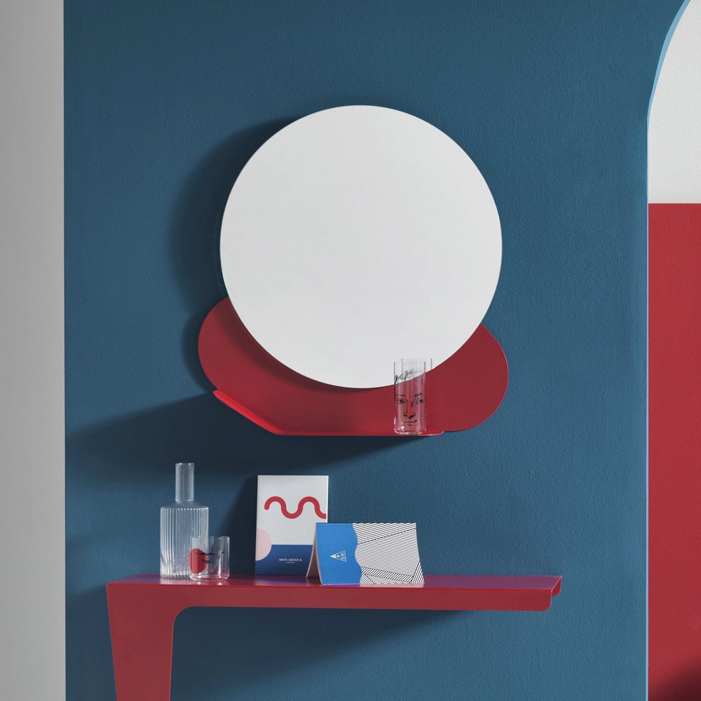 Această oglindă de perete cu design modern se potrivește în contexte tinere datorită raftului inferior din metal colorat cu culori vii și contemporane, care delimitează formele rotunde ale oglinzii și creează continuitate cu mediul înconjurător. Un produs practic și funcțional, cu un design original și sclipitor capabil să caracterizeze diferite contexte, de la intrarea în camera de zi, precum și în baie sau dormitor.