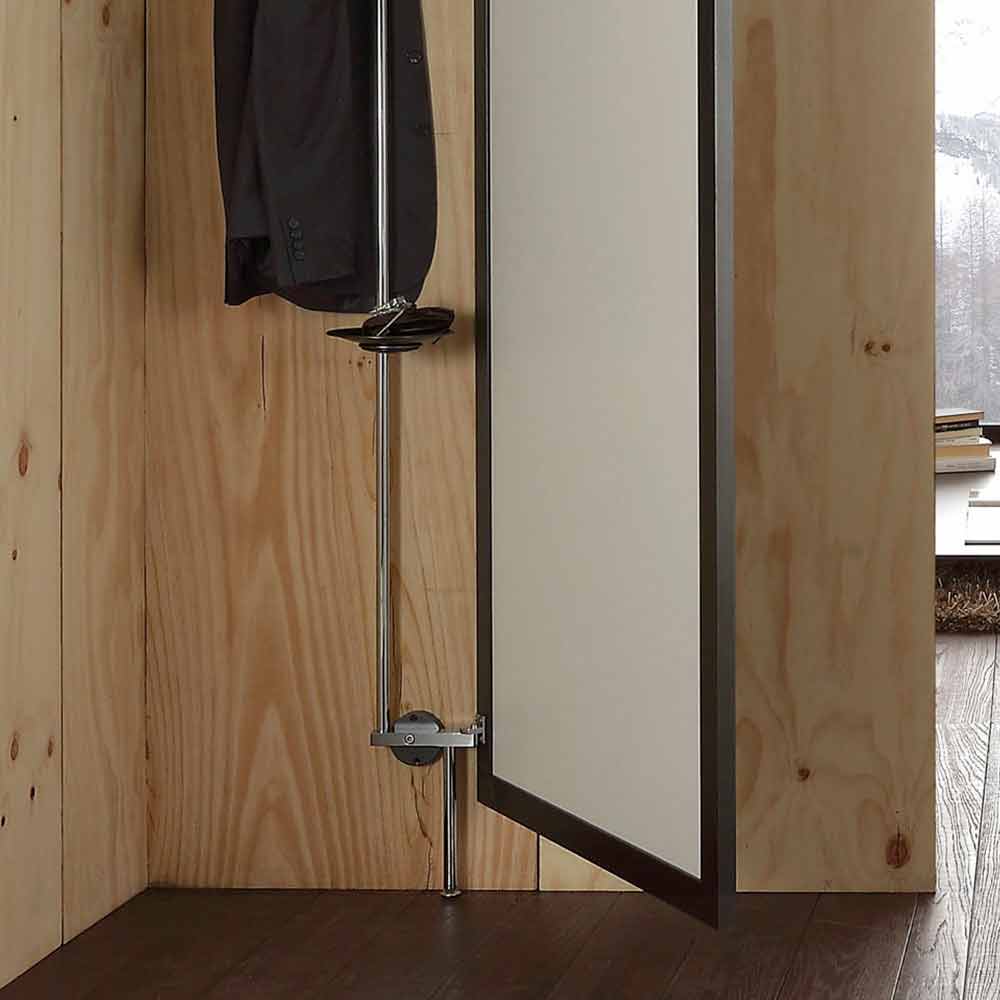 Oglindă inovatoare de perete din sticlă afumată cu deschidere fabricată în Italia cu cadru din metal vopsit negru complet cu sistem de perete din metal cromat, care include 3 cârlige de acoperire și o placă de depozitare practică. Un design extrem de simplu și esențial este combinat cu o idee originală și inovatoare, dând astfel viață unei soluții de amenajare funcționale capabile să se adapteze la orice mediu în care creează un spațiu ascuns pentru a fi dedicat organizării diferitelor obiecte. Structura sa este concepută pentru spațiile de colț ale casei care de multe ori nu sunt folosite, dar care pot fi transformate în zone practice în care să plasați genți, paltoane și multe altele, reușind să mențineți un mediu curat și ordonat.