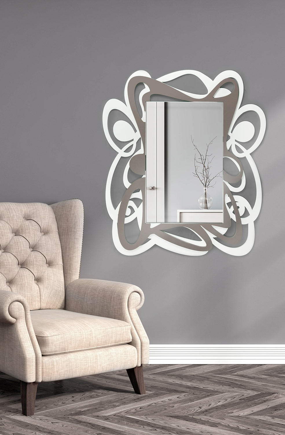 Oglinda mare de perete din alb si lemn de cacao decorata si taiata cu laser, fabricata in Italia.