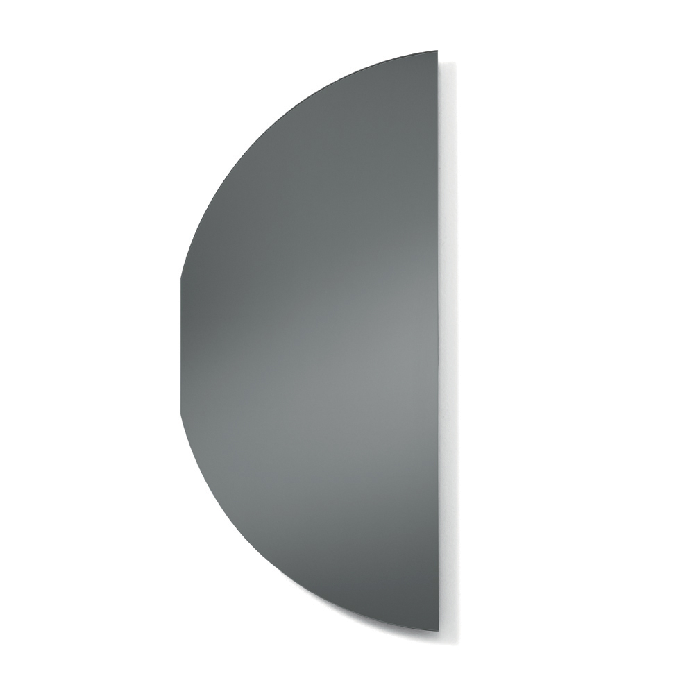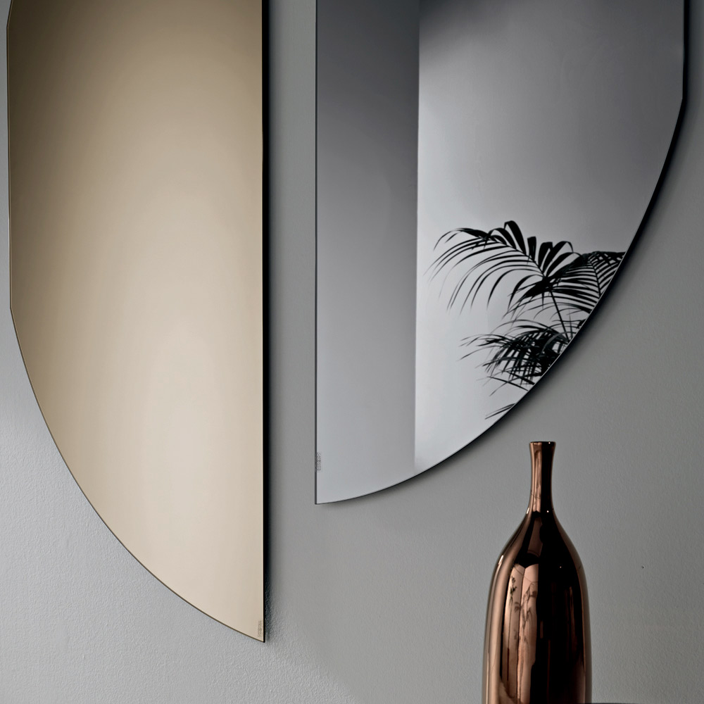 Oglinda prezintă o formă conturată care amintește de un semicerc cu o curbă întreruptă , creând o siluetă originală și armonioasă. Această geometrie esențială conferă oglinzii o prezență vizuală puternică, menținând în același timp o estetică minimalistă și rafinată.