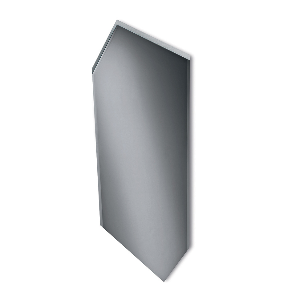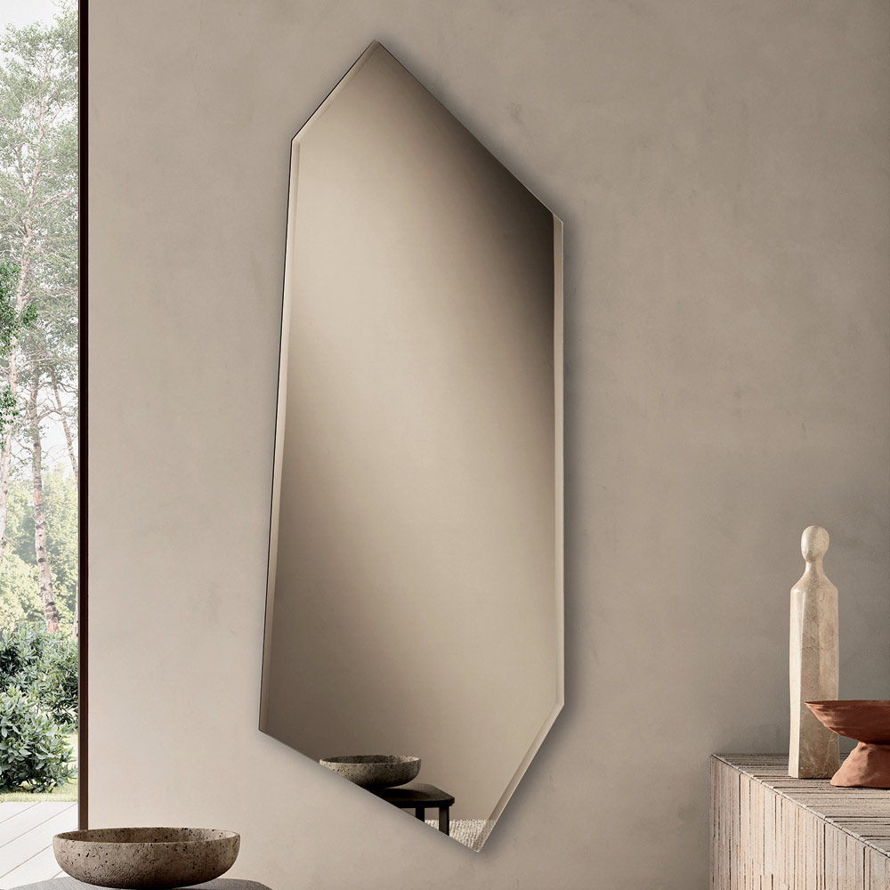 Oglinda prezintă o formă neregulată care amintește de un dreptunghi deschis pe șase laturi, creând o siluetă modernă și neconvențională. Profilul este înfrumusețat cu o teșitură parțială pe patru laturi , un detaliu discret, dar prețios, care accentuează contururile și adaugă luminozitate suprafeței reflectorizante.