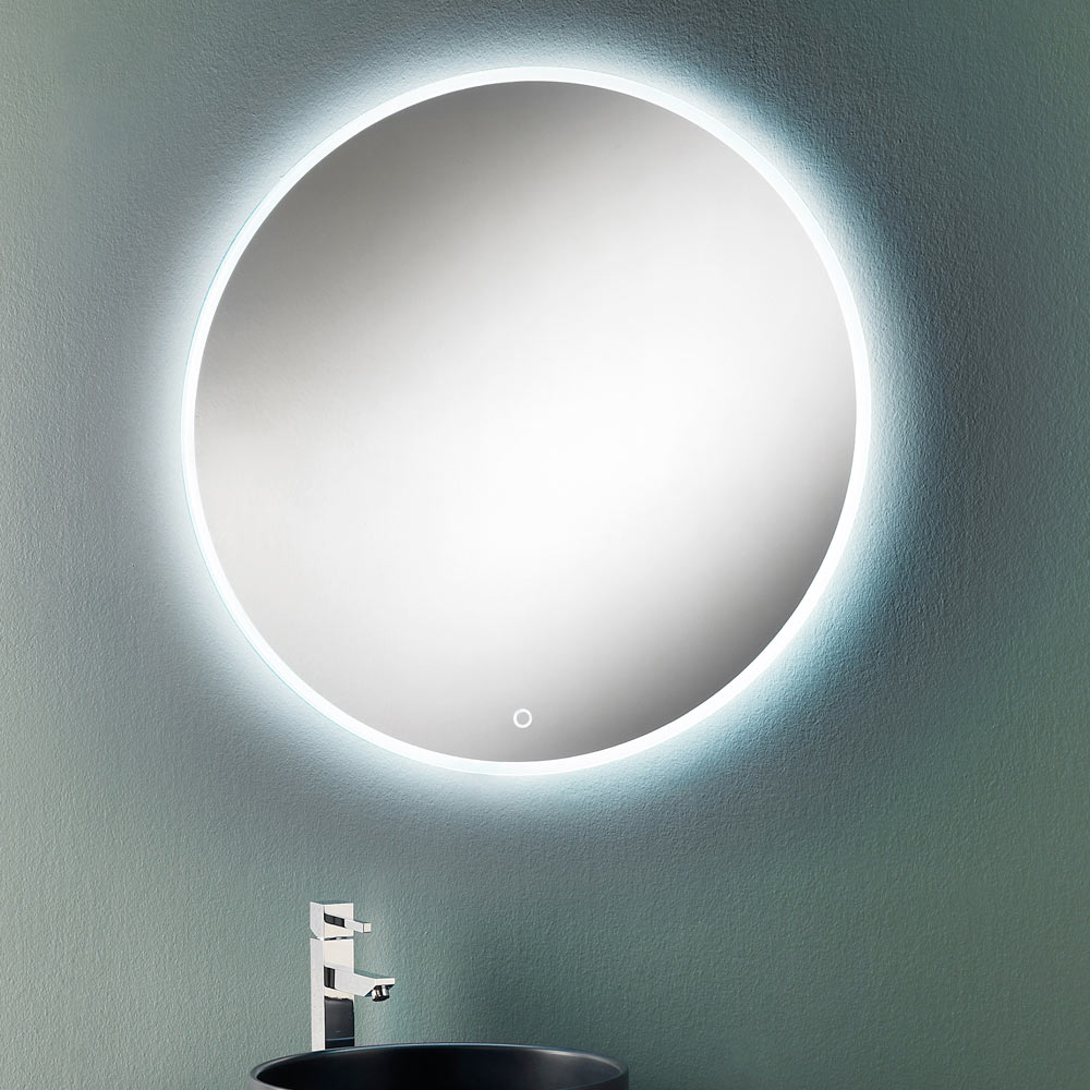 Oglinda de baie rotunda de perete de design modern cu margine sablata si iluminata din spate, fabricata in Italia.
