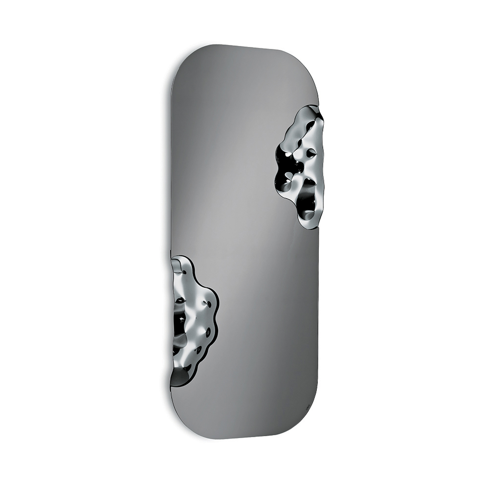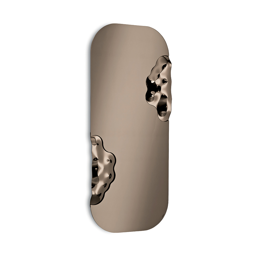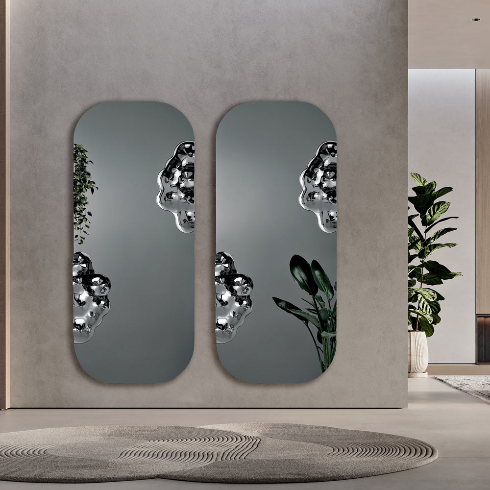 Suprafața dreptunghiulară cu colțuri rotunjite conferă echilibru și ușurință vizuală compoziției. Două elemente din sticlă texturată ton pe ton sunt inserate pe lateralele oglinzii, poziționate simetric pe laturile verticale, adăugând textură și profunzime designului, creând un contrast elegant între suprafețele netede și texturile elaborate.