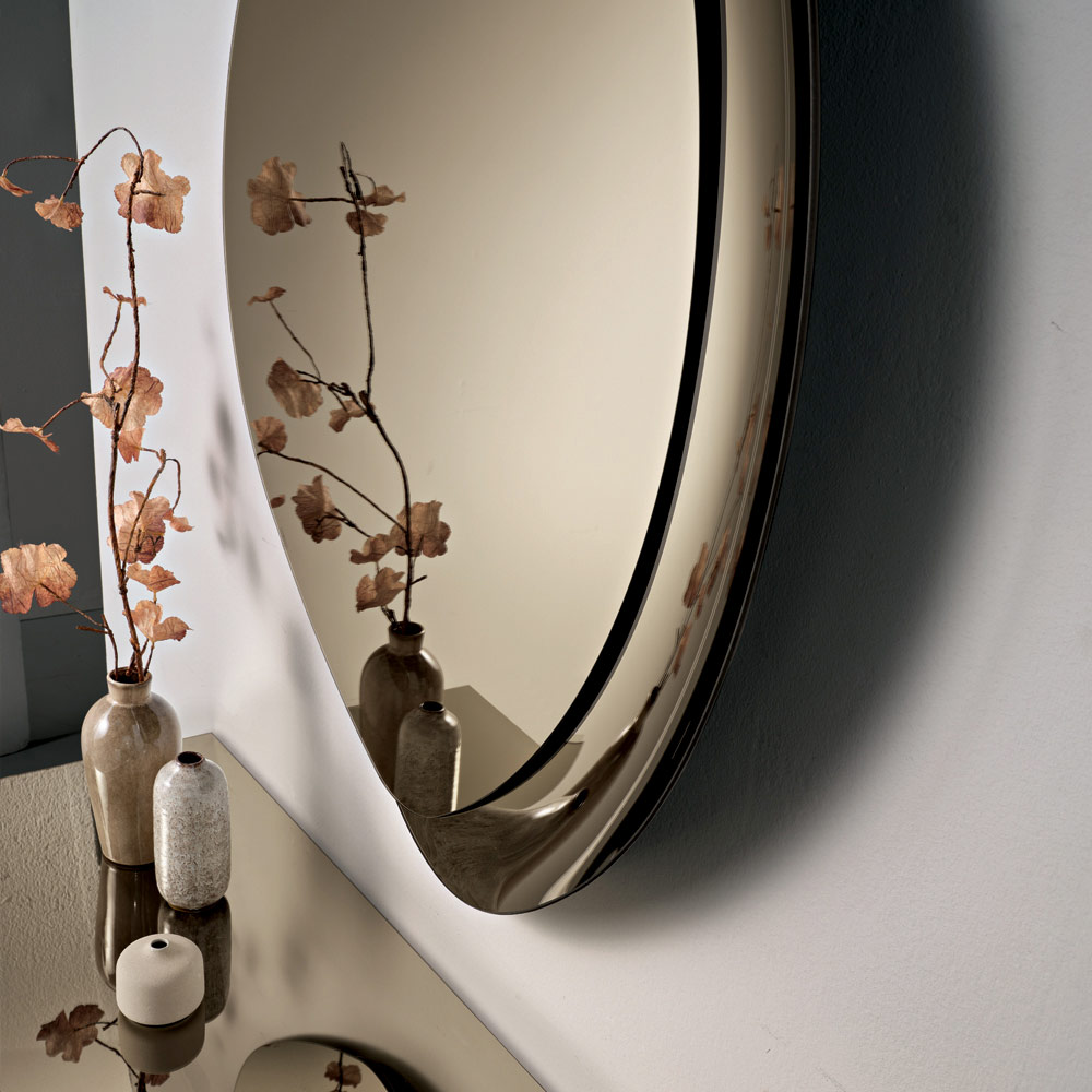 Designul prezintă o semi-ramă distinctivă din sticlă fuzionată ton pe ton, care încadrează parțial suprafața reflectorizantă. Acest detaliu adaugă textură și luminozitate , creând un joc captivant de reflexii care conferă oglinzii profunzime și caracter.