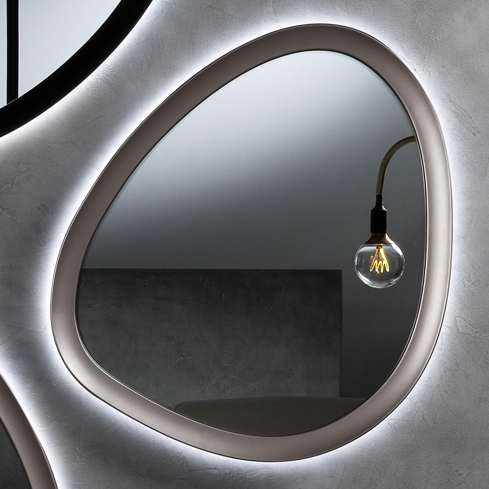 Cufundați-vă în farmecul acestei oglinzi cu iluminare din spate , un adevărat element de mobilier care transformă fiecare perete într-o galerie de artă modernă. Cu forma sa se distanțează de convenționalitate, devenind un punct focal care captează privirea și stimulează imaginația.
